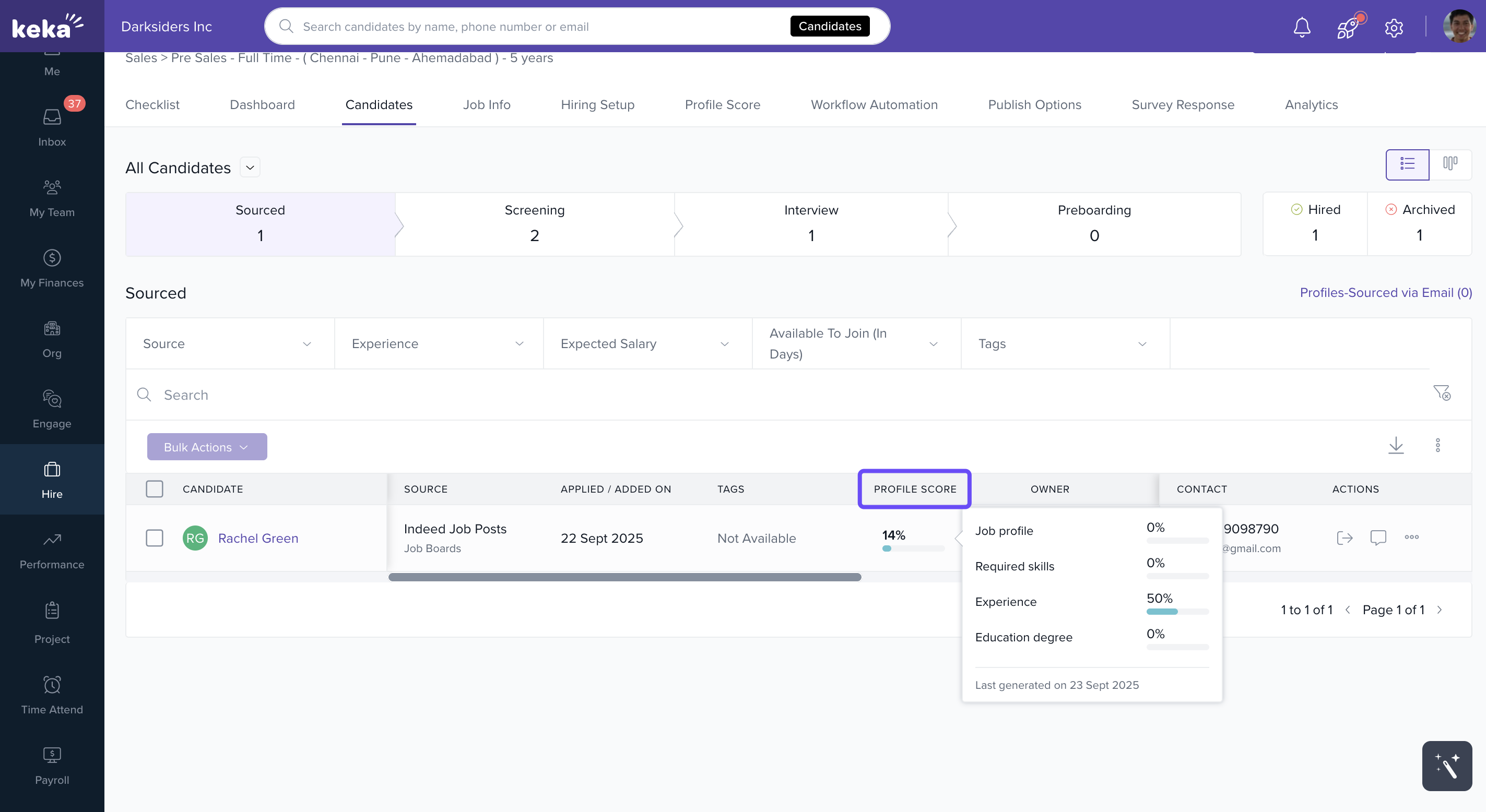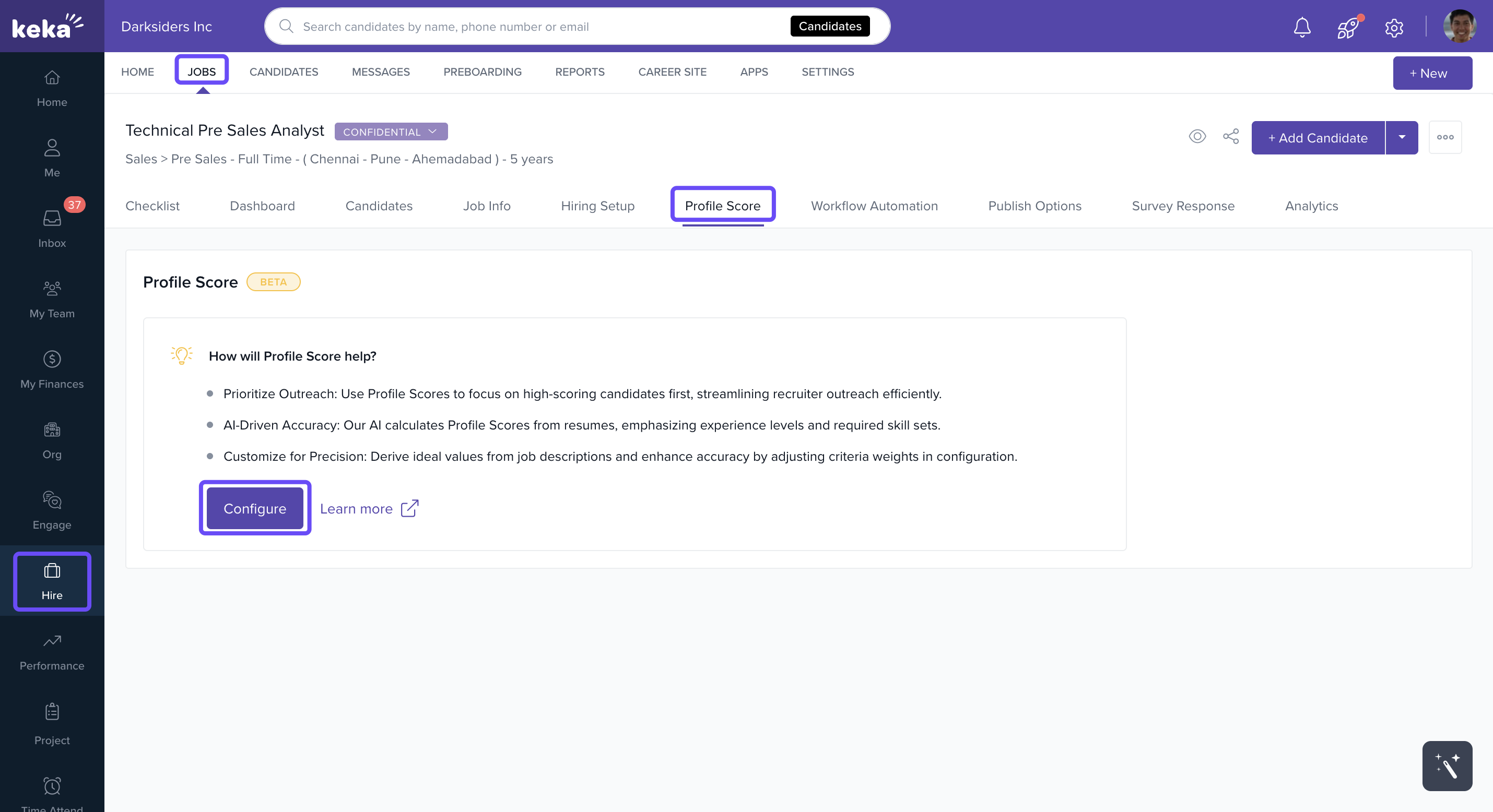 This is where Candidate Profile Scores in Keka Hire can help. The system automatically rates candidates based on predefined job requirements, reducing manual effort and helping you focus on the best fits faster.