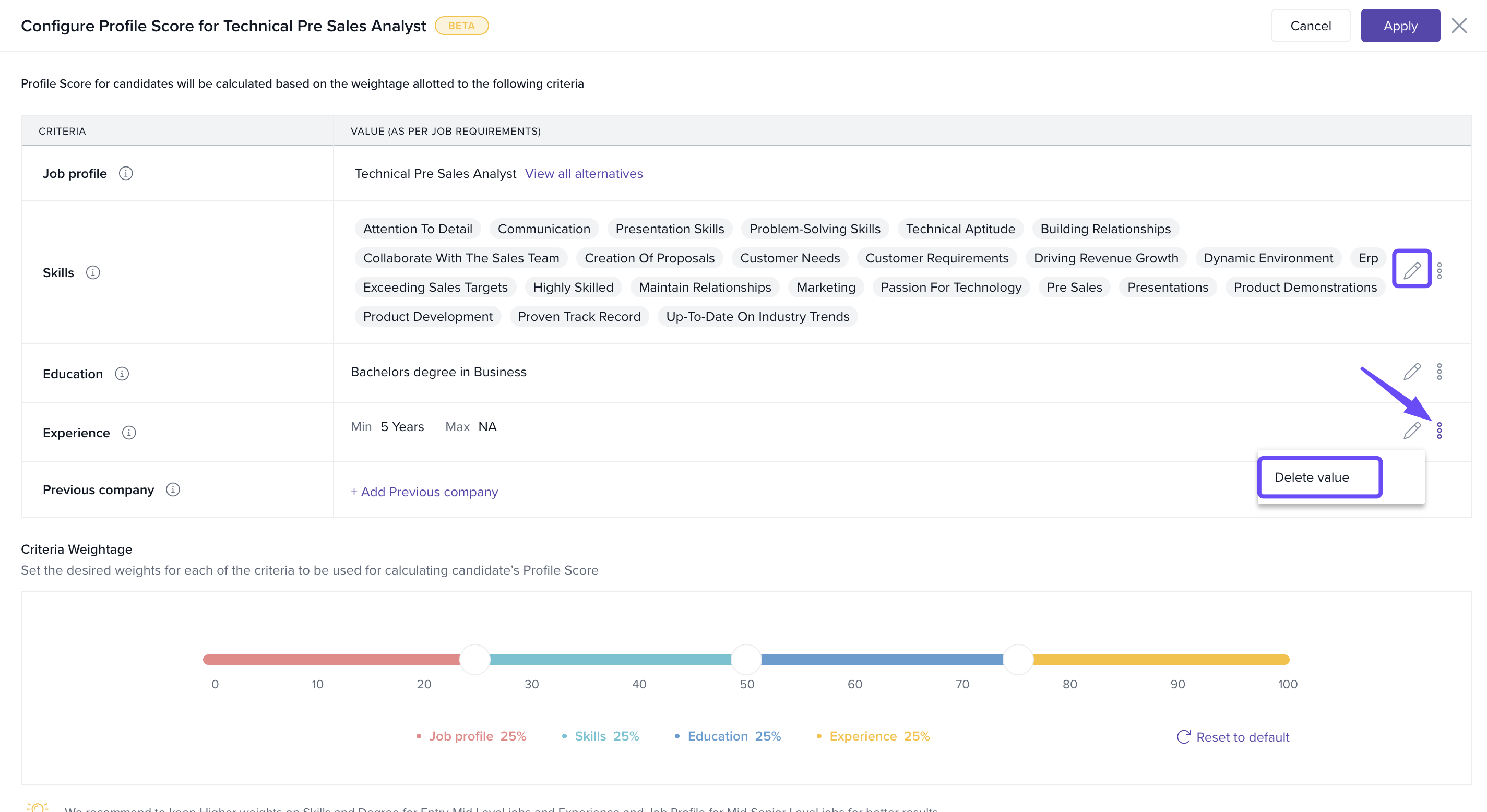 For each job, you can assign weightages to these parameters. When a candidate applies, Keka calculates: