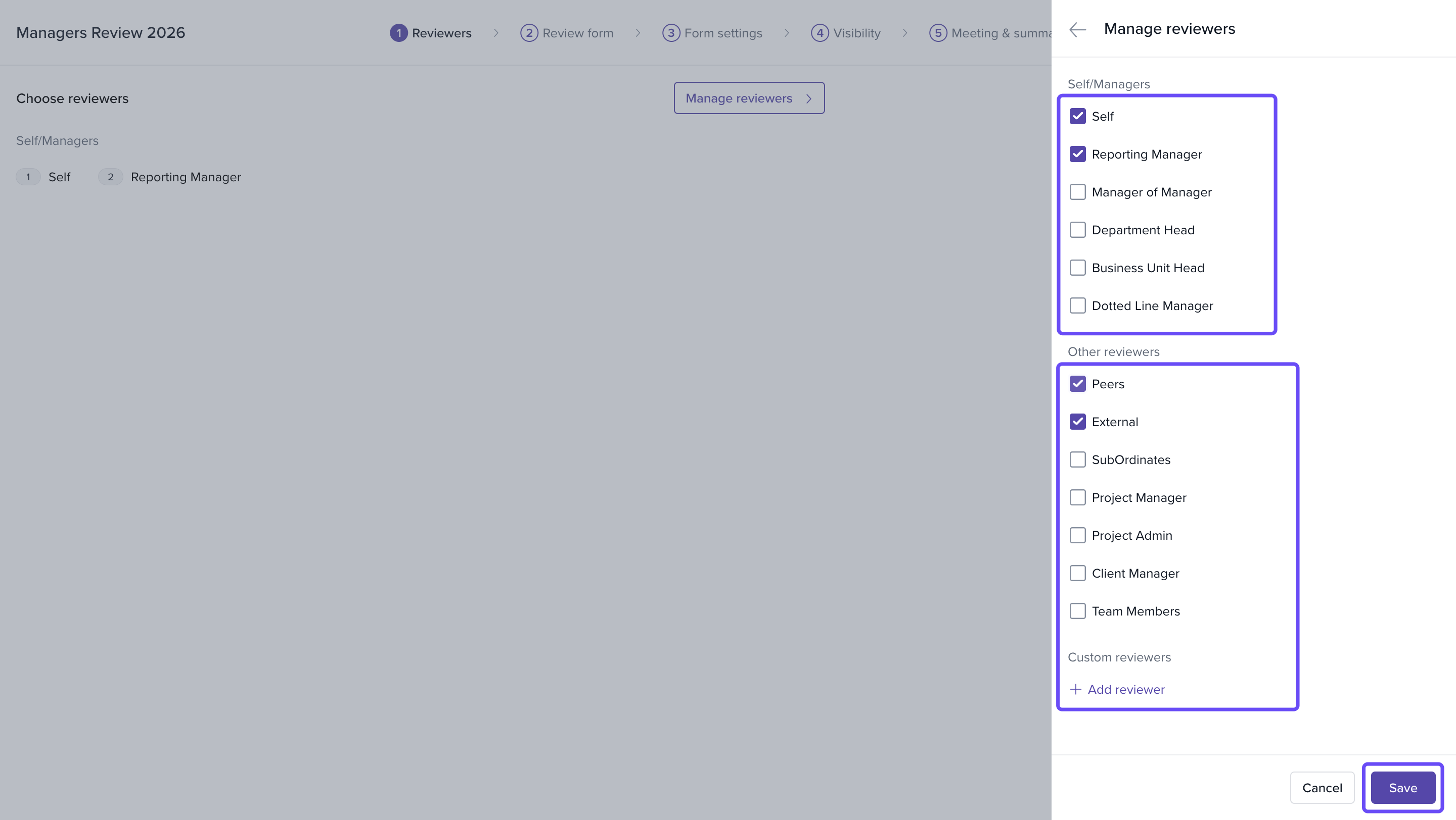 Inside the Manage reviewers panel, you can add or remove reviewer types based on your organisation’s feedback model.