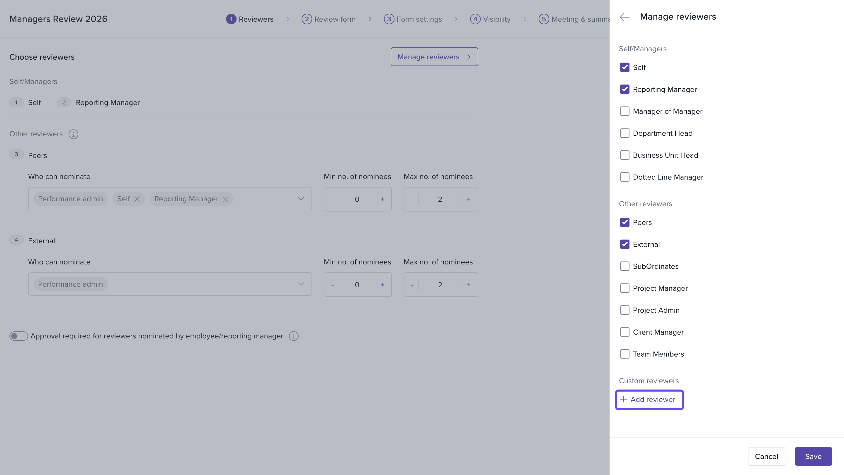 Custom reviewer roles can also be added using + Add reviewer.