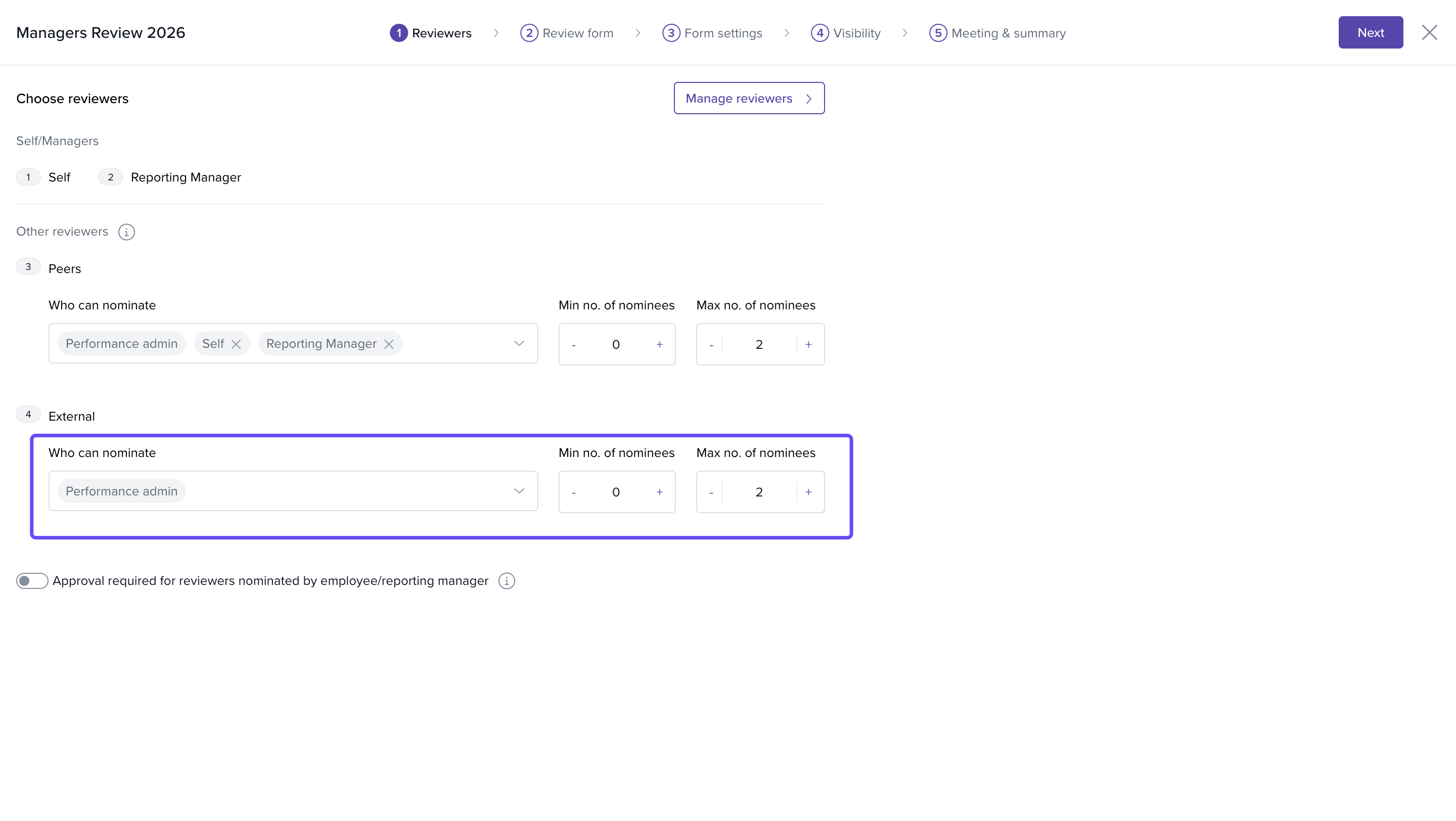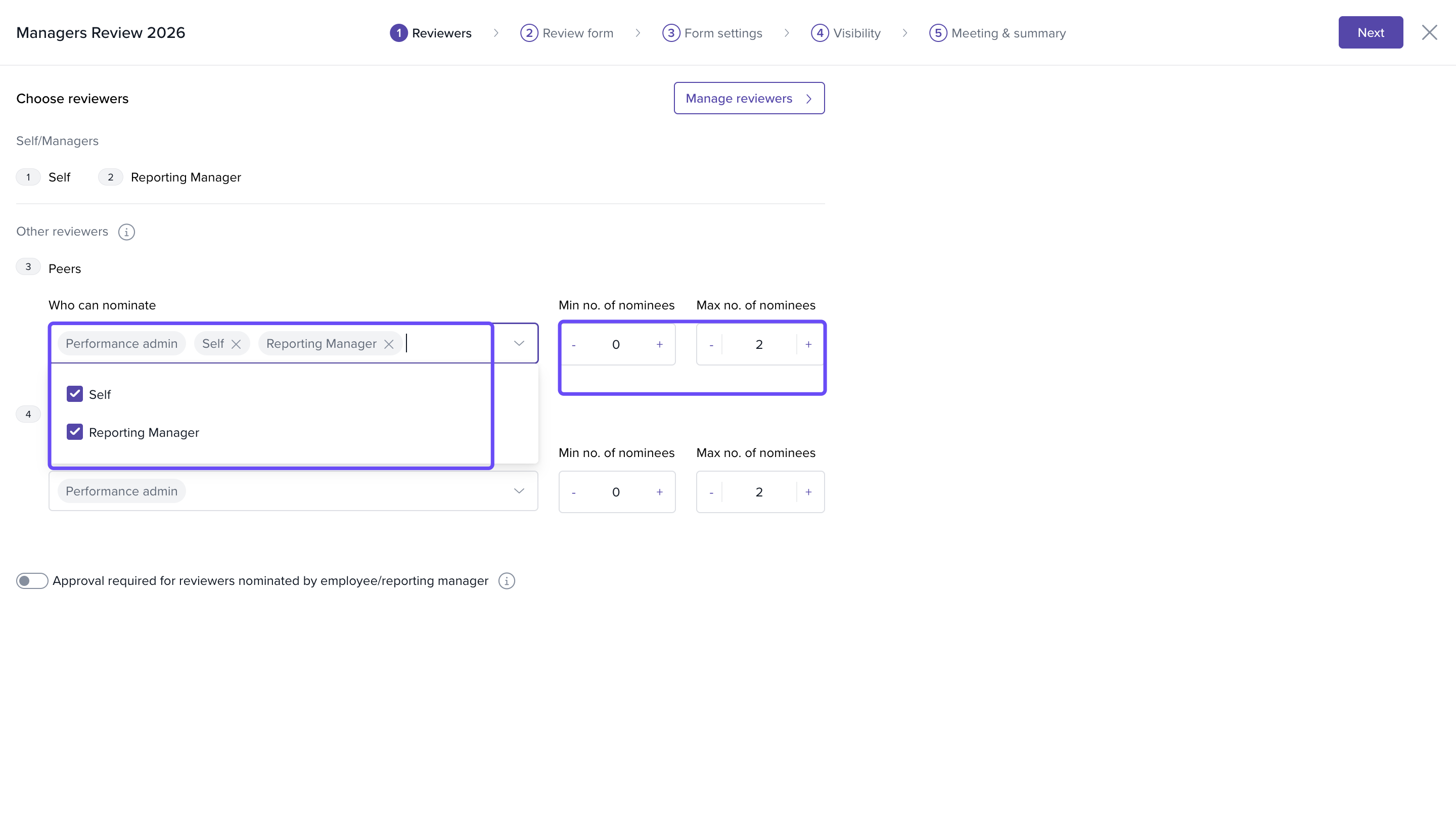 Note: Setting minimum and maximum nominees keeps the review process focused and manageable. For example, limiting nominees to two ensures relevant feedback without overload.