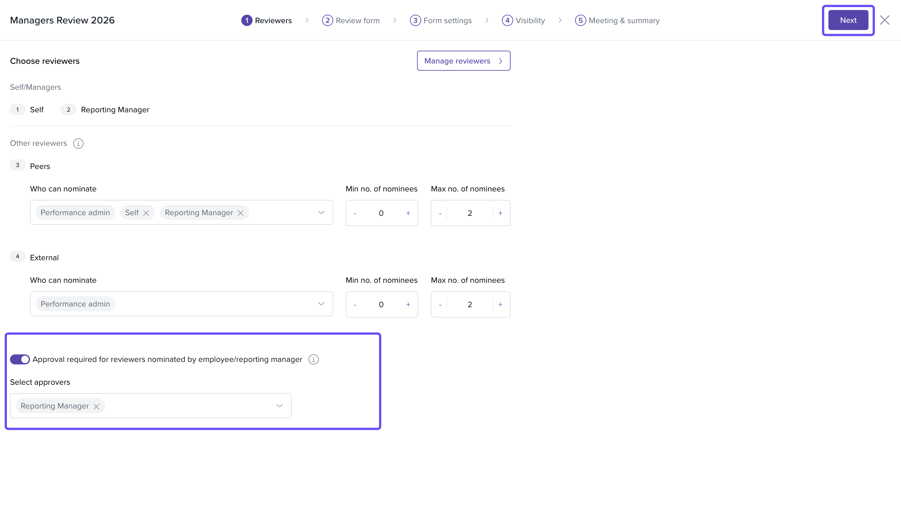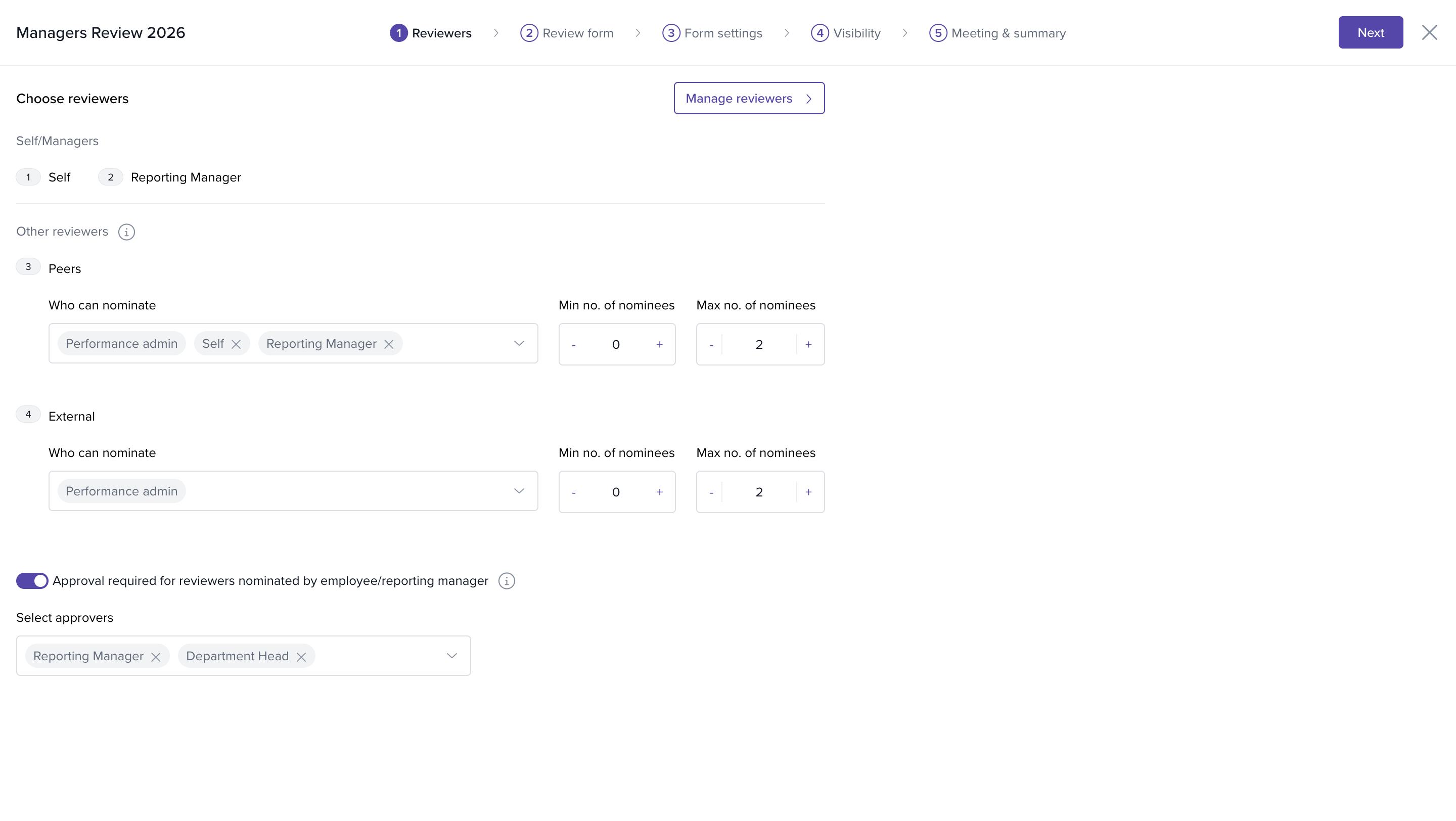4. After saving, your selected reviewer roles appear on the main reviewers page. Click Next to proceed to the next configuration step.