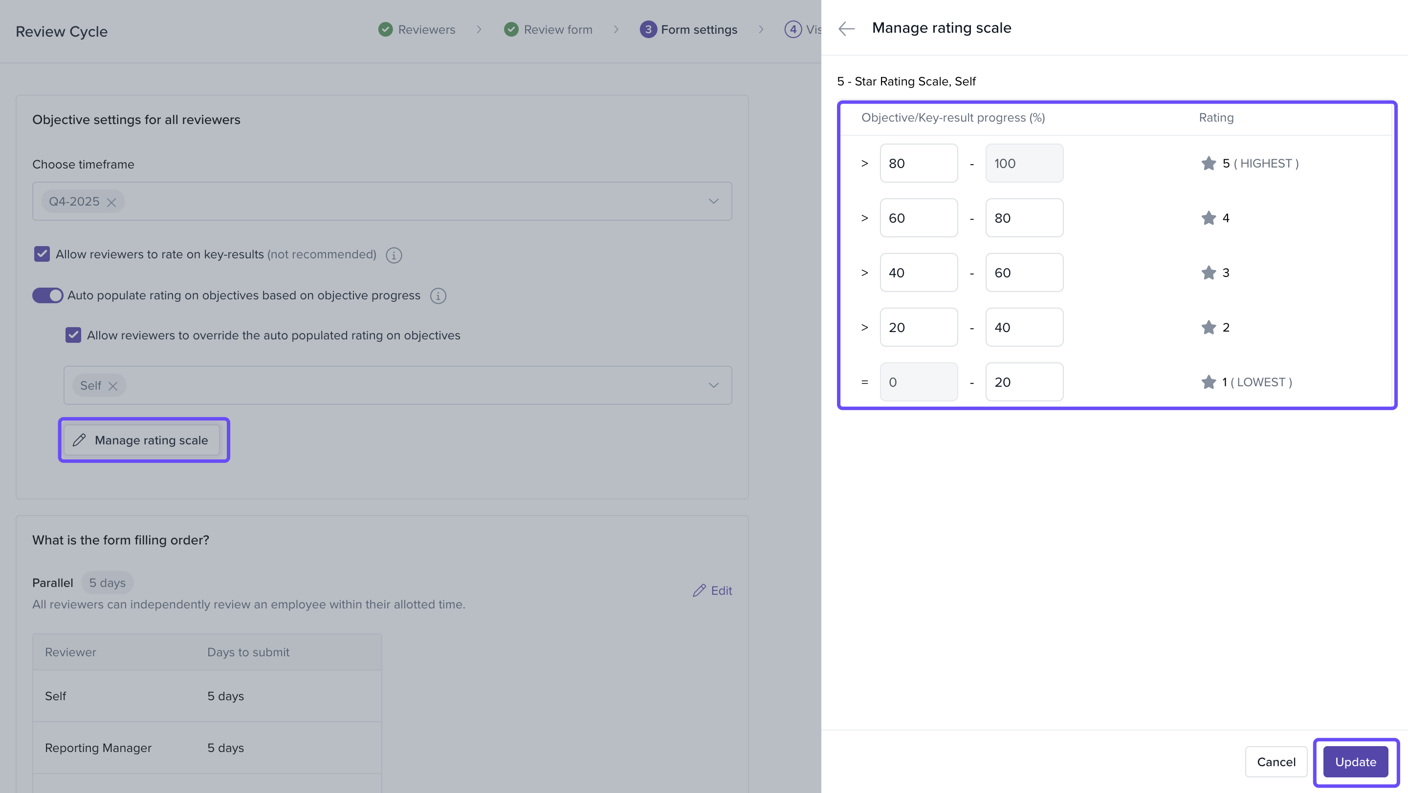 - Enable Auto-Populate Ratings to generate scores based on goal completion.