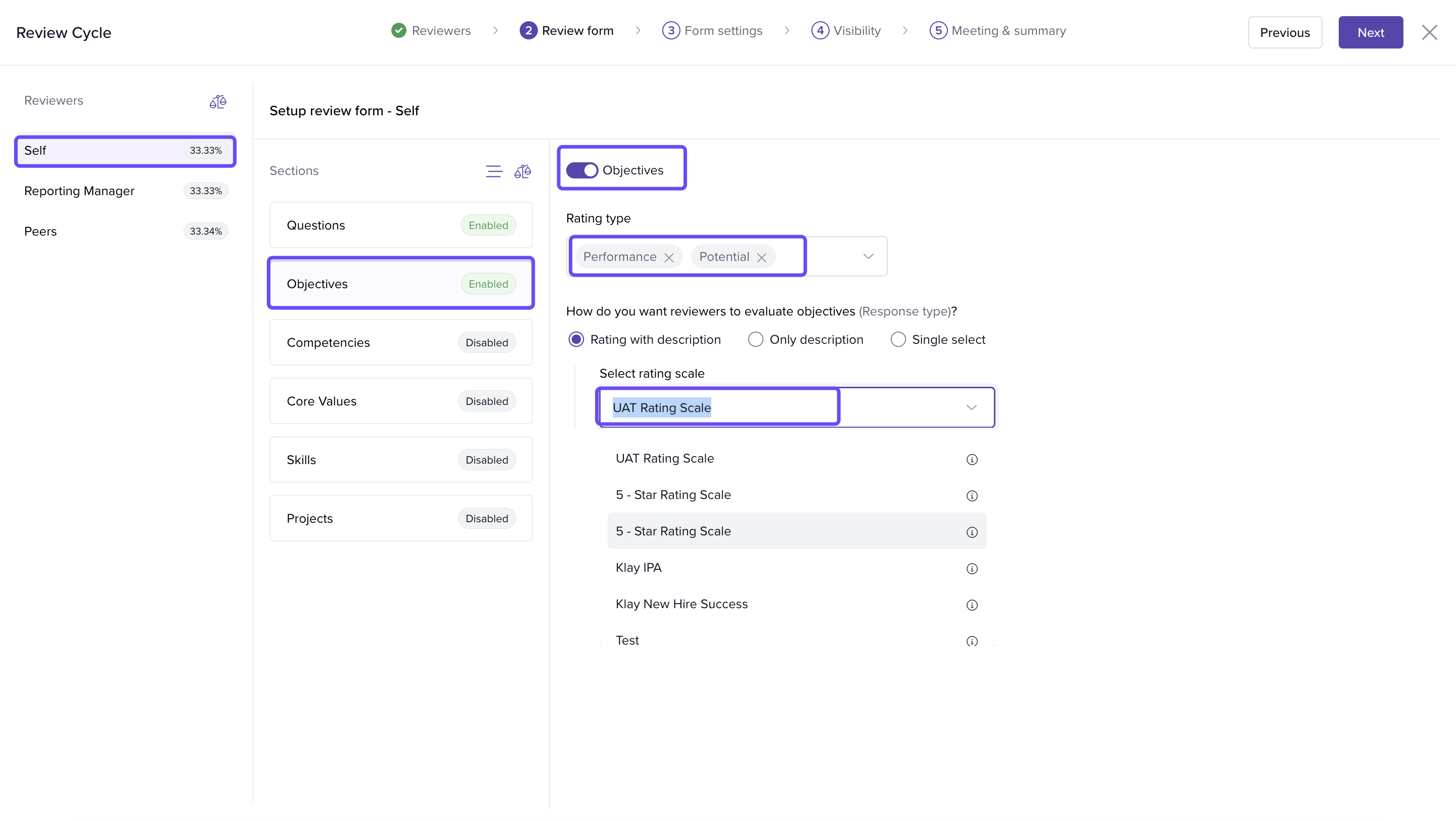 To apply ratings, click Select Rating Scale and choose from predefined options (e.g., 5 Rating Scale, Design Review Scale, Development Review Scale).