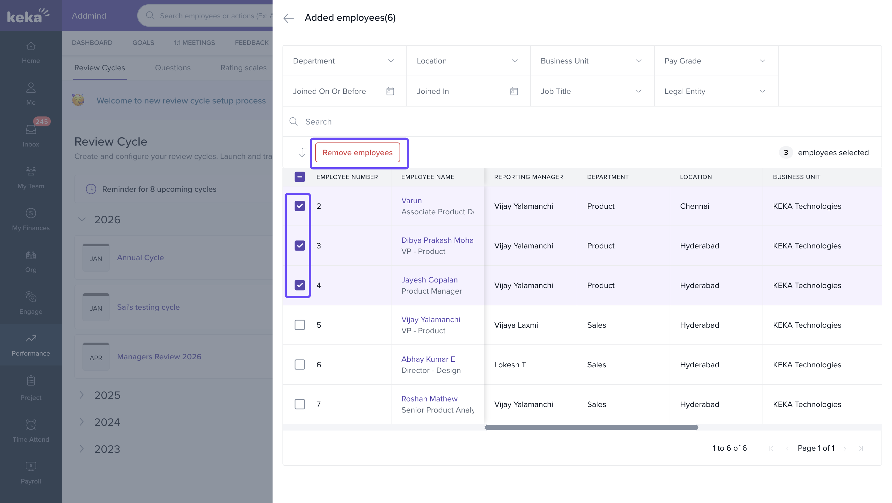 - Once selected, you can also remove employees if needed. Select the employees and click on Remove employees.