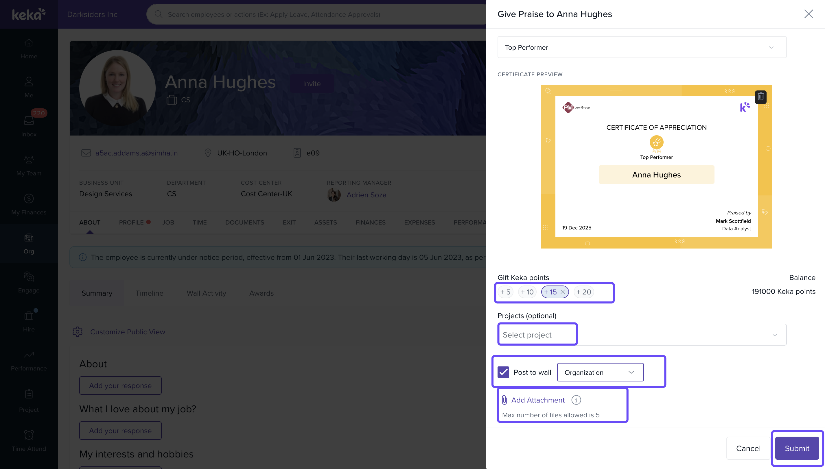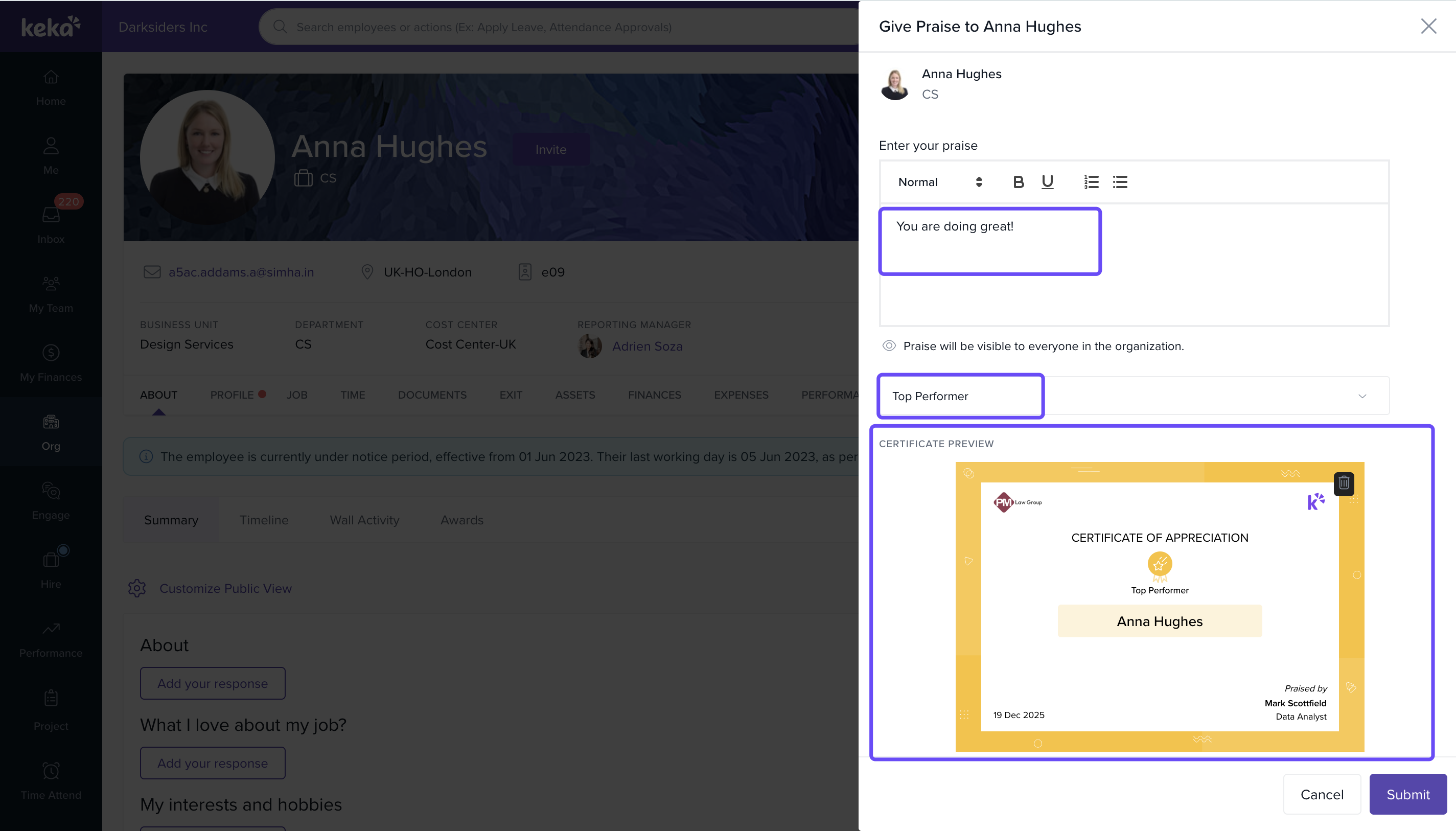 Recognising and appreciating employee efforts boosts morale, builds stronger teams, and reinforces a culture of excellence. In Keka, managers can easily give praise to employees and view all appreciation shared across their team.