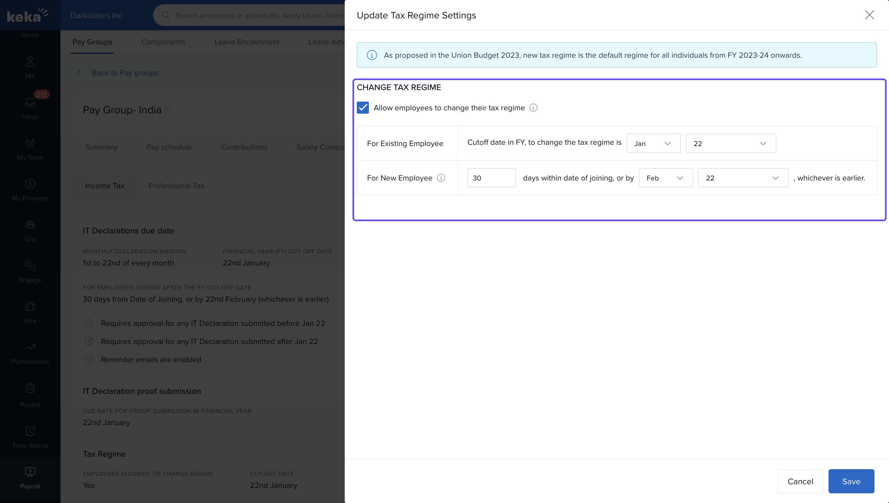Uncheck "Allow employees to change the tax regime" to restrict employees from changing their tax regime. Only admins can make changes.
