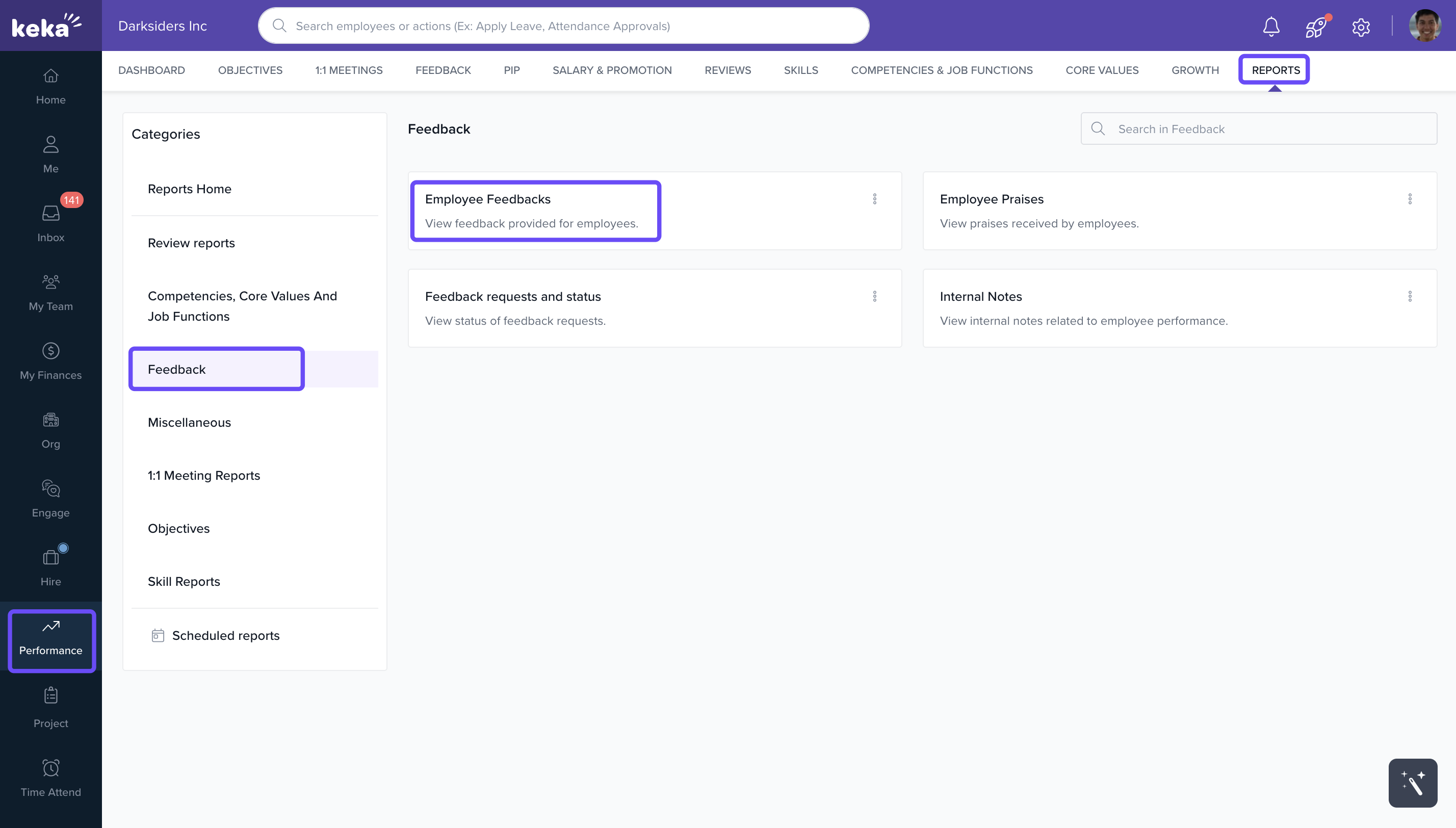 - Go to the Performance section of the Keka Portal, and click on Reports; then, under Feedback, please click on Employee Feedbacks.
