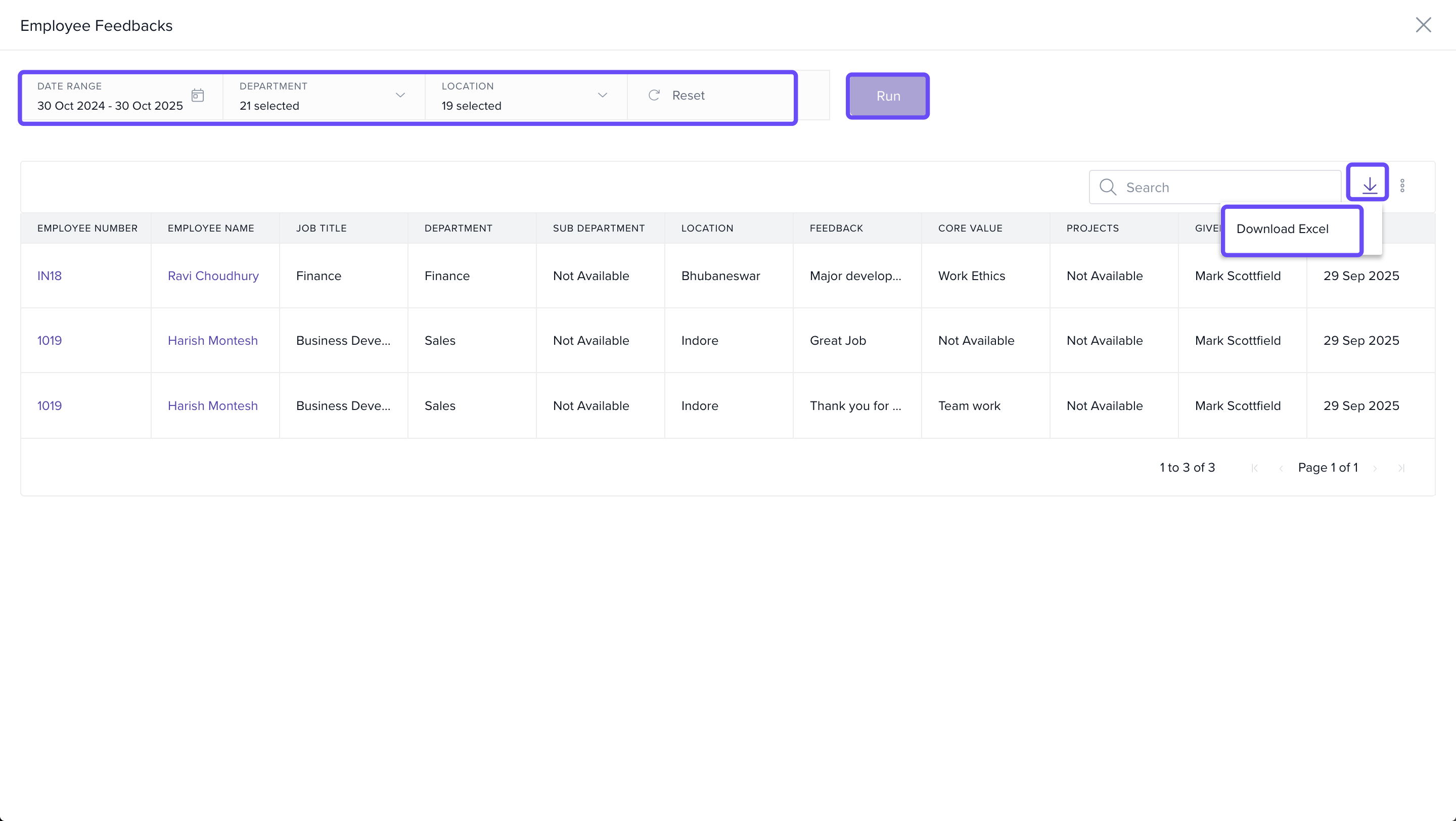 2. Once you click on the Employee Feedback report, select the Date Range (Mandatory), Department, Location, and click on Run . Once you click on run, a report will be generated, and you can download the report in the Excel format.