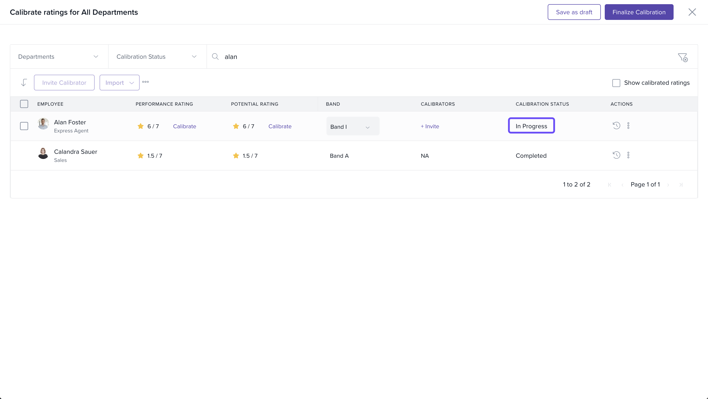 The employee’s calibration status will be set to In Progress, as the calibration process will be repeated, and their review is now open for further refinement.