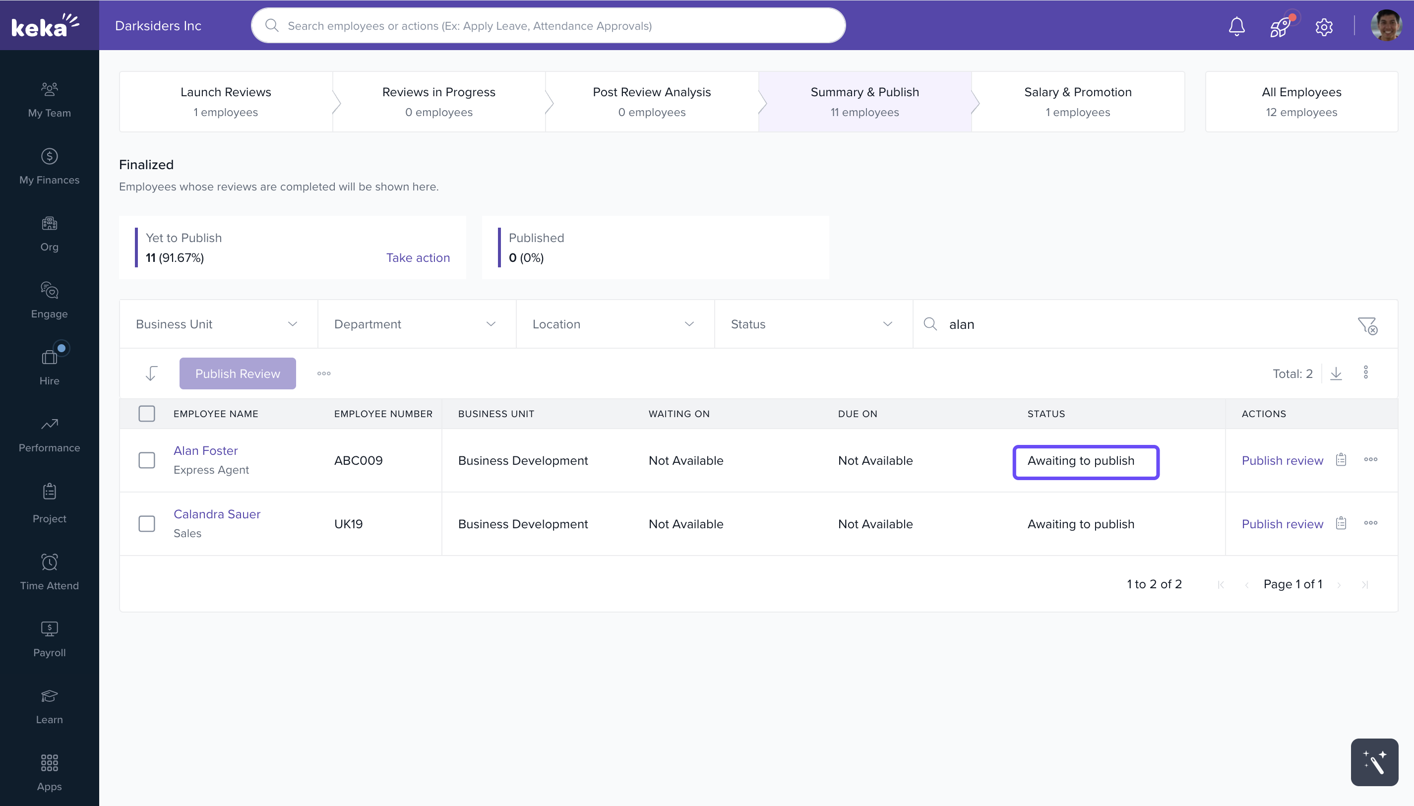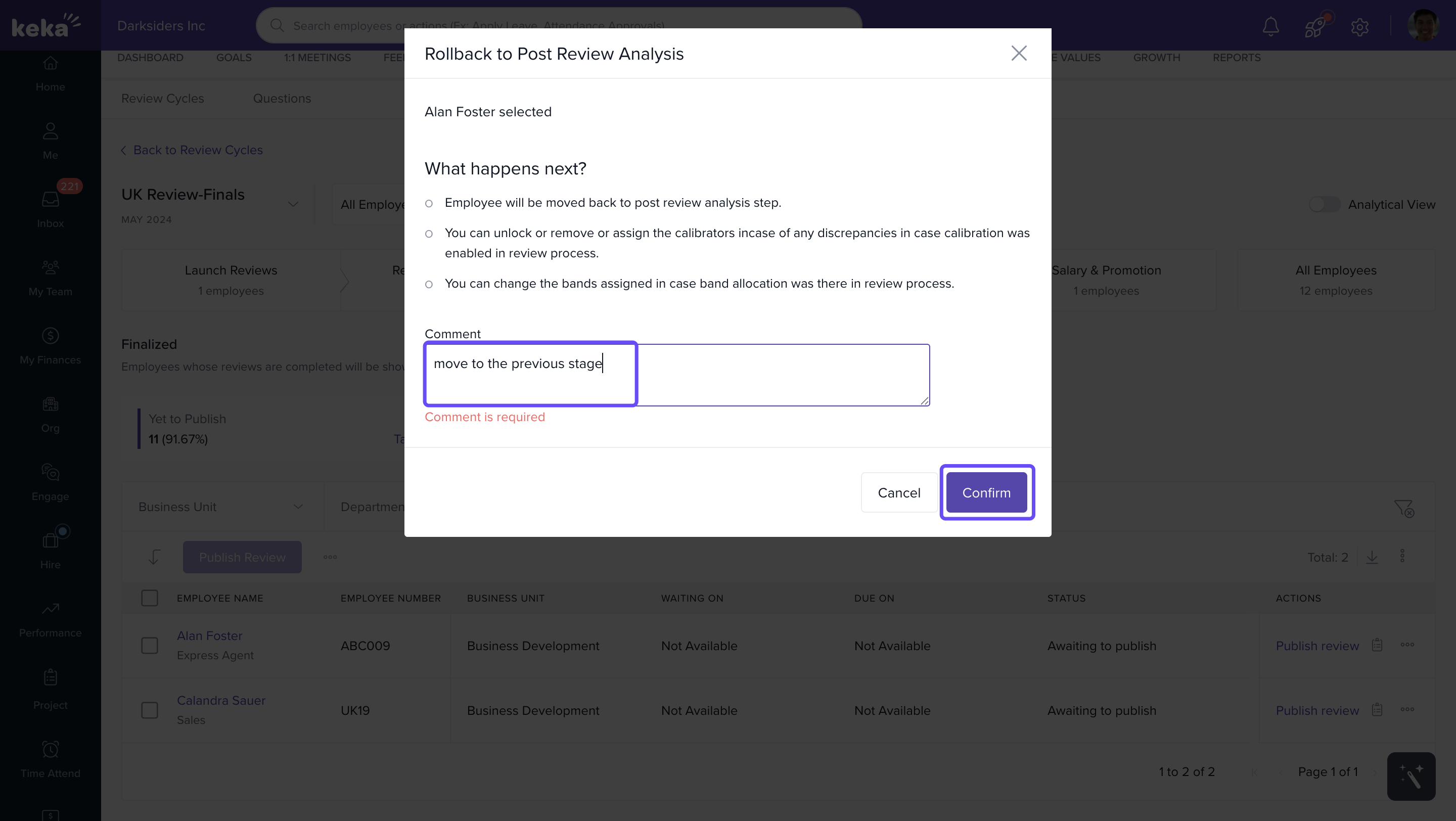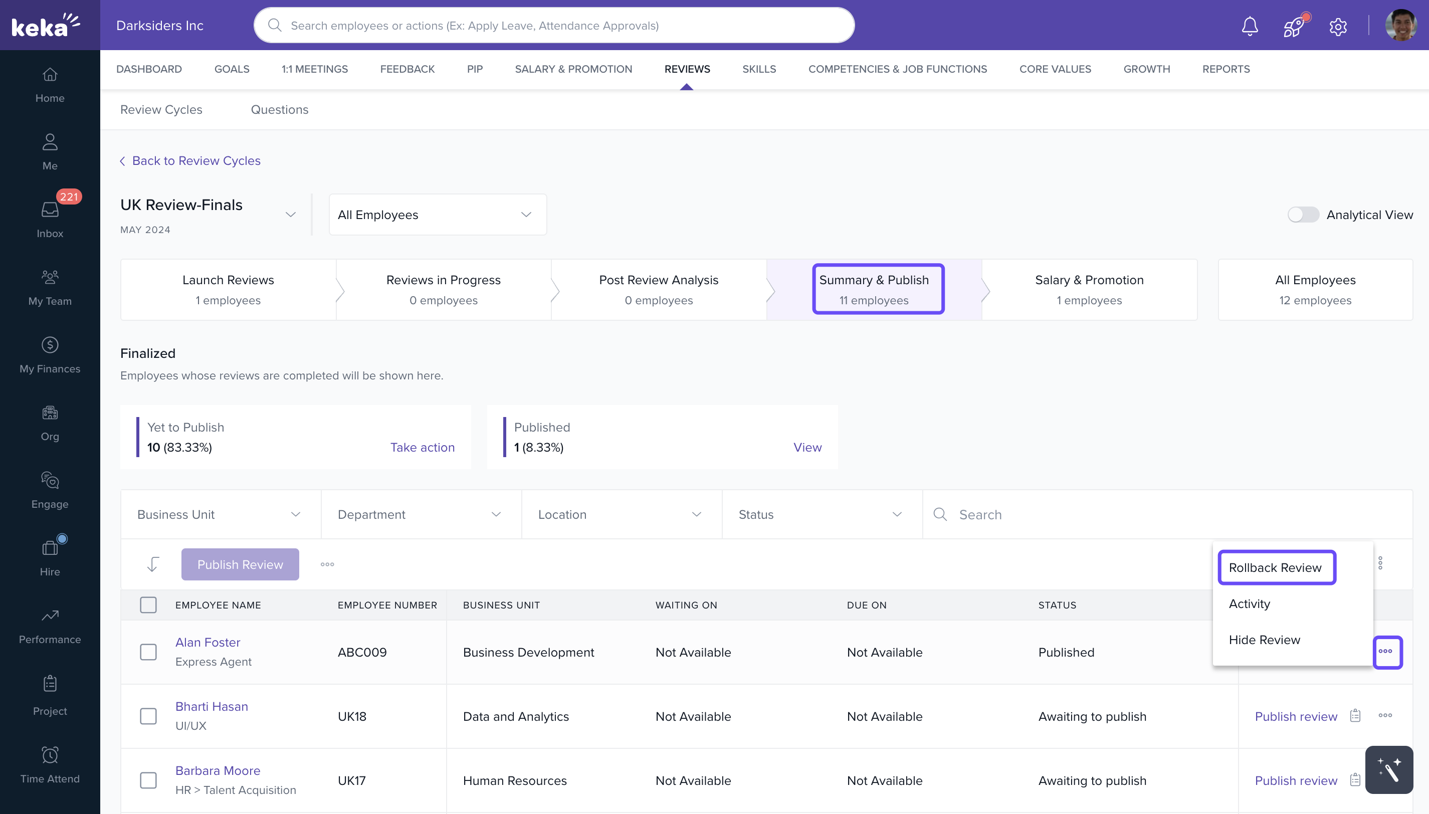 Keka allows performance admins to roll back an employee’s review, enabling corrections and restarting the final review stages without restarting the entire cycle.