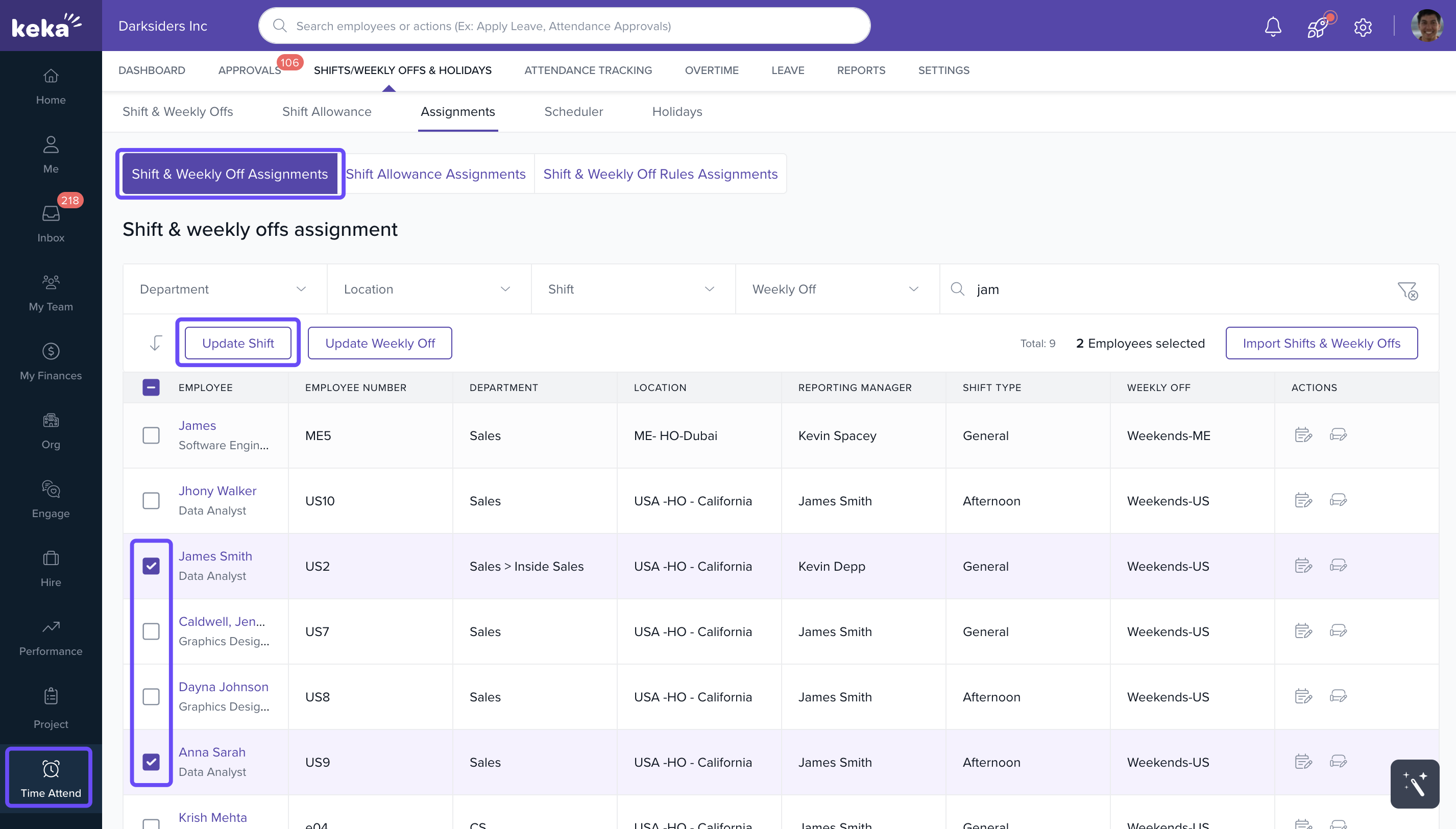 - Navigate to Time Attend > Shift/Weekly Offs & Holidays > Assignments.