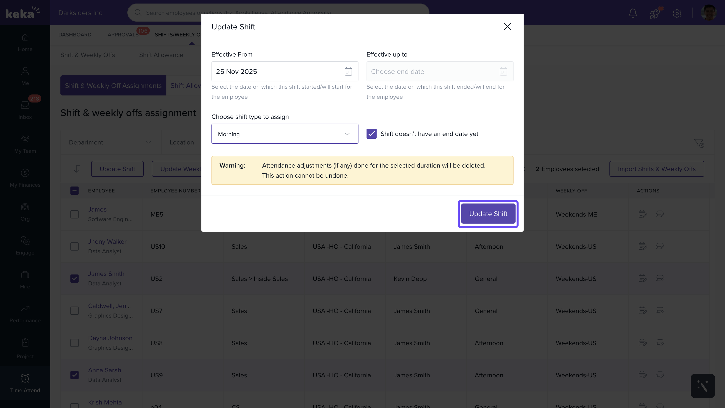 - Select the employees you wish to assign the new shift to and click Update Shift.