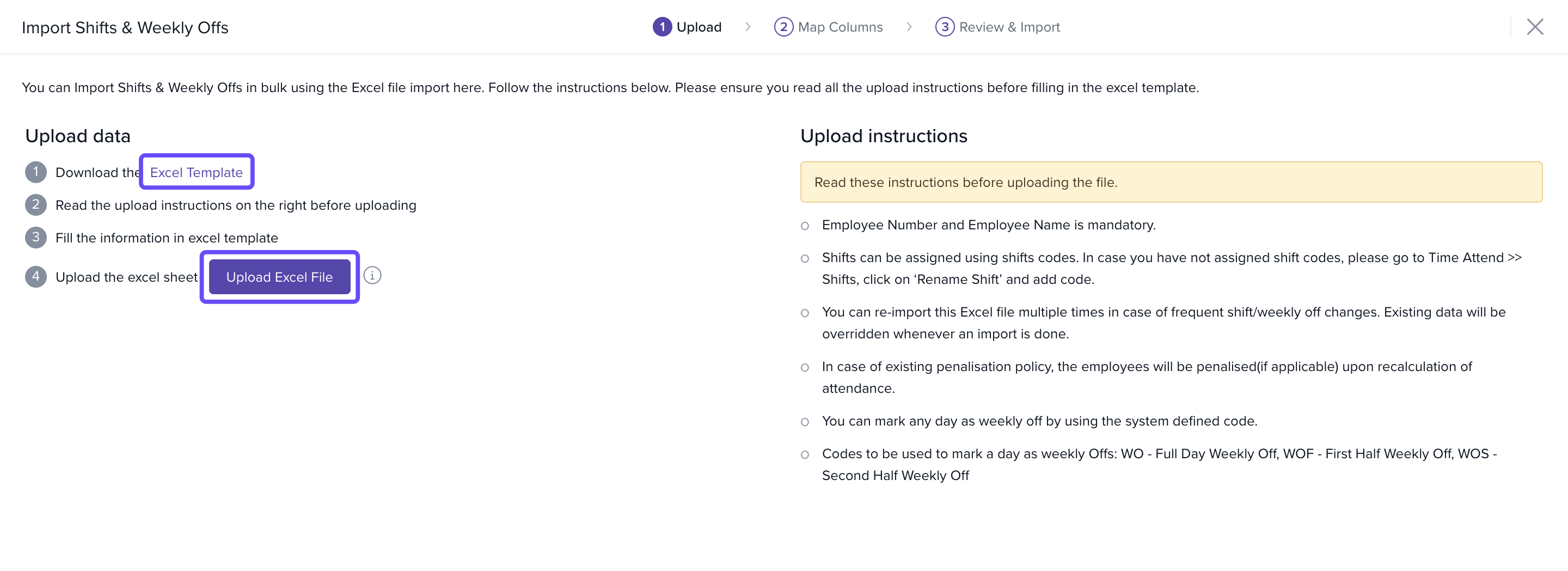 - Under Shift & Weekly Off Assignments, click Import Shifts & Weekly Offs.