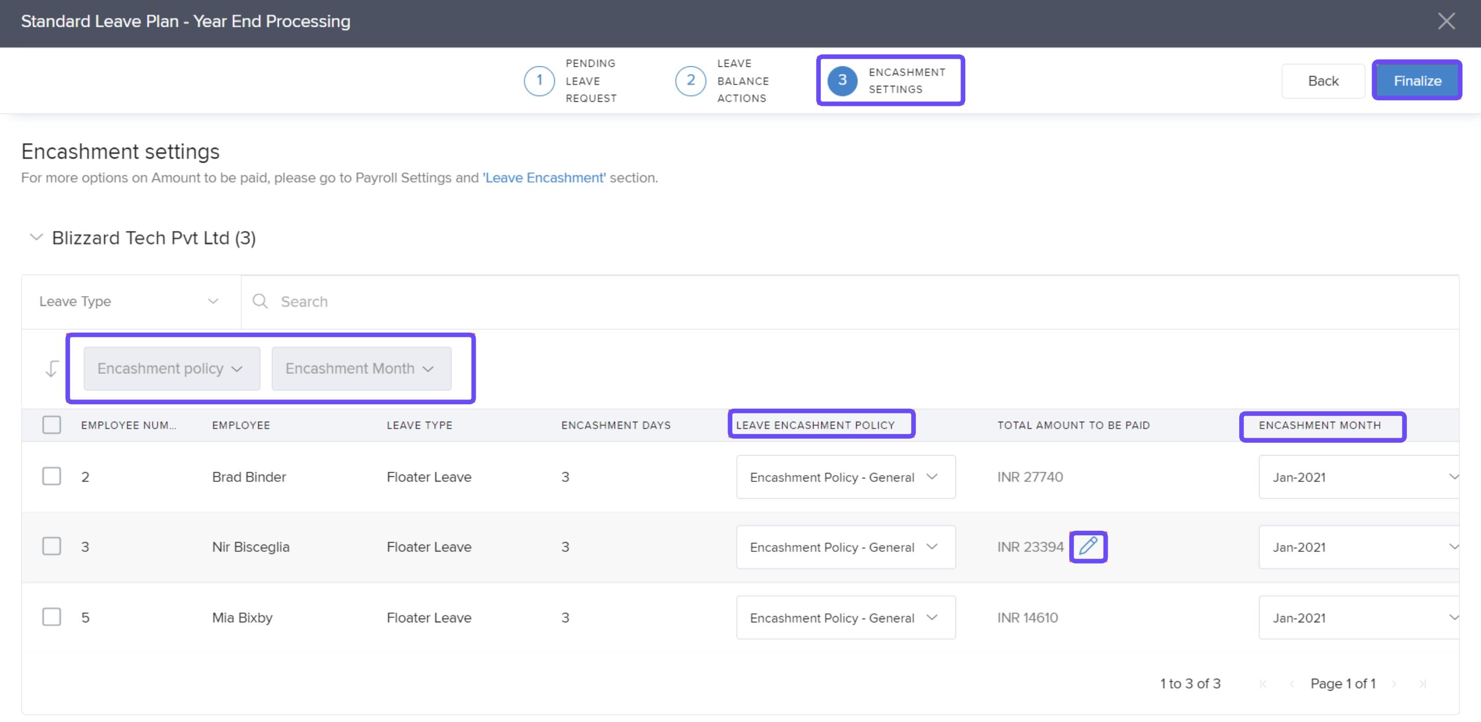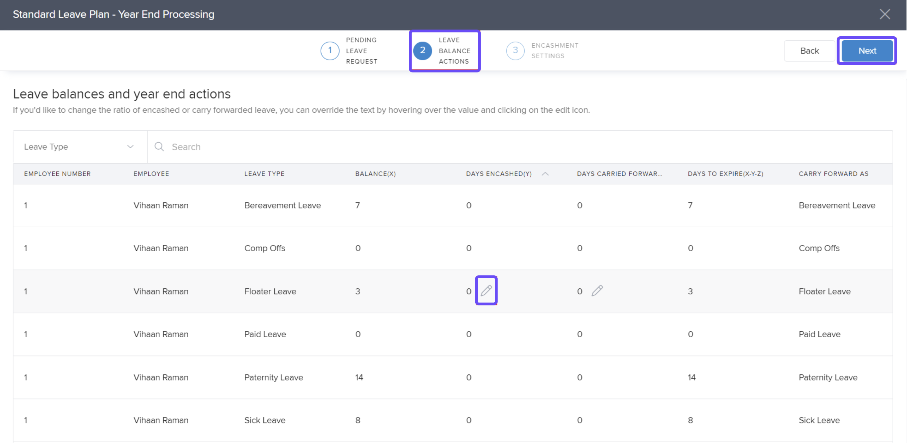 - Click the Edit icon to modify Days Encashed or Days Carried Forward.