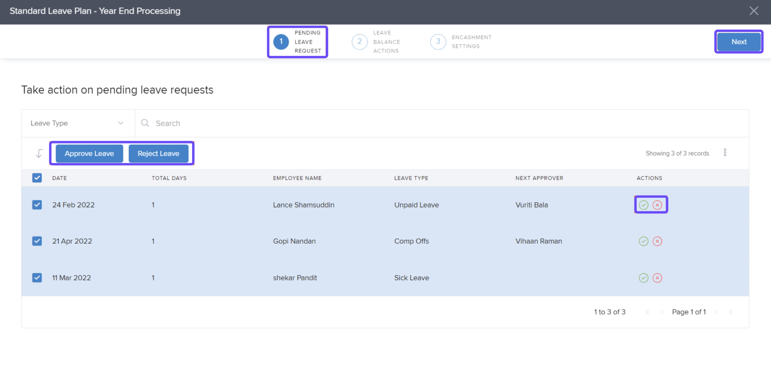 - In the Pending Leave Request section, take action on all pending leave requests: