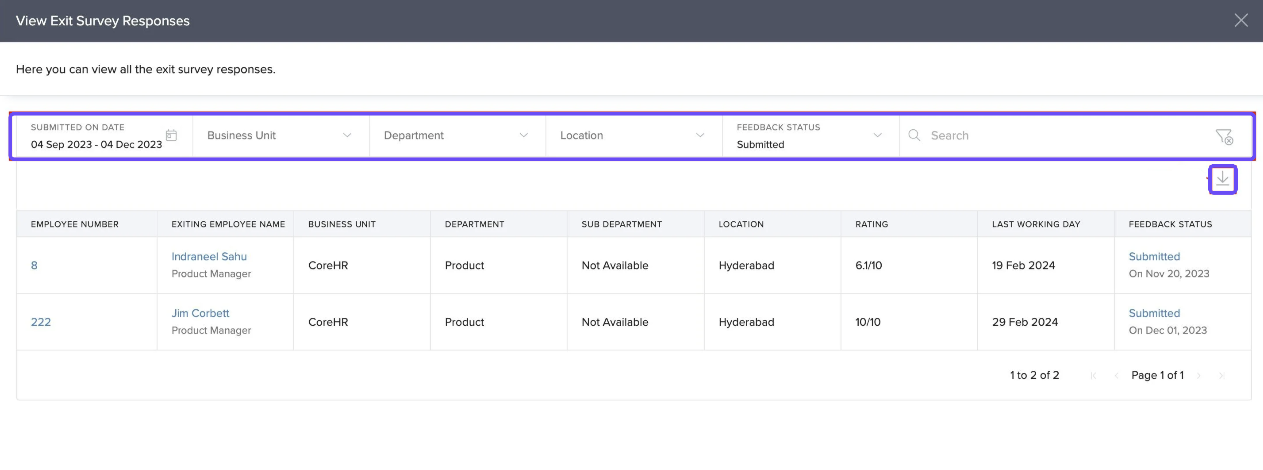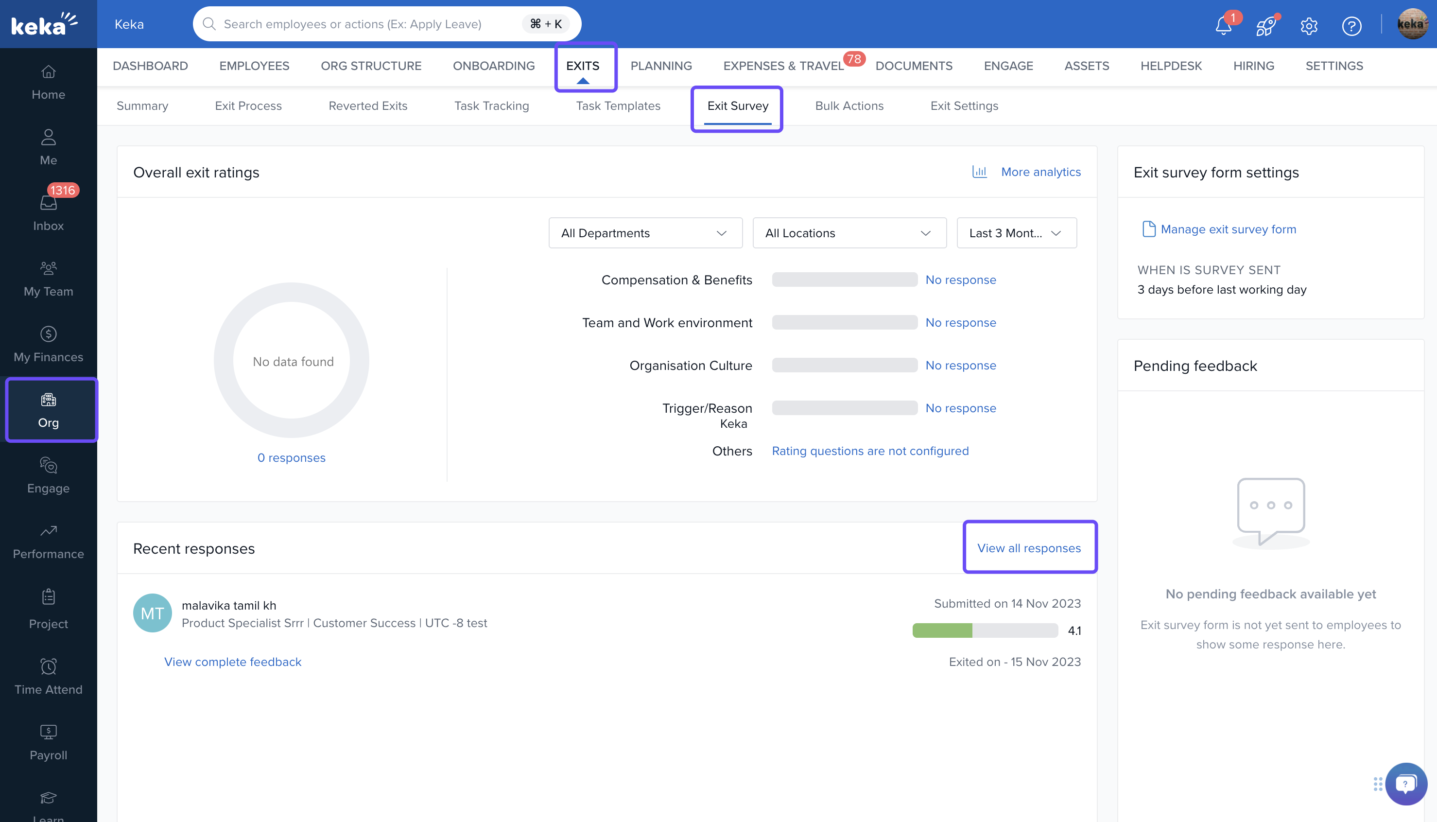 Exit surveys are crucial for understanding why employees leave, providing valuable insights for improving retention. Keka allows you to download a consolidated report of all responses received for the exit survey.