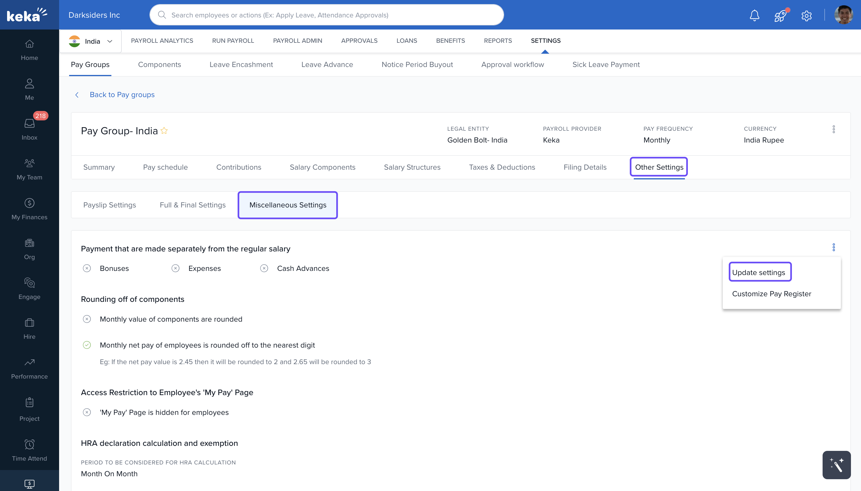 In the paygroup page, select Other Settings → Miscellaneous Settings.