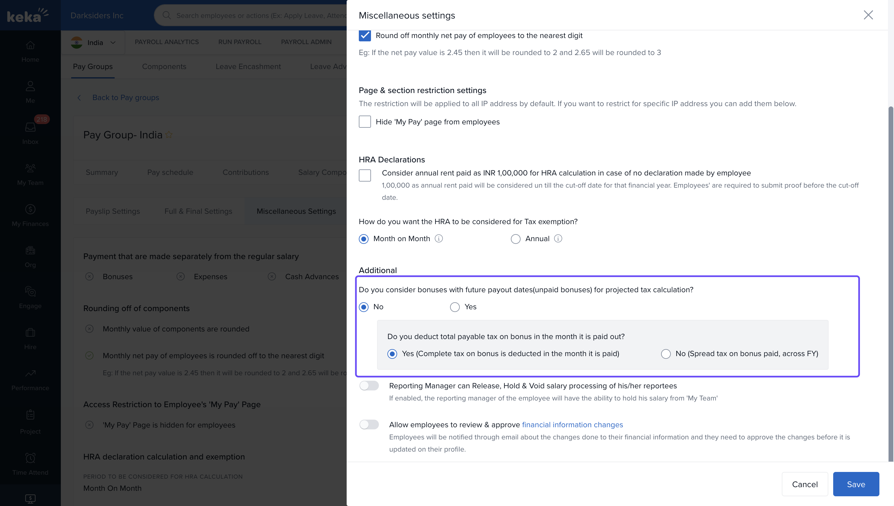 Do you consider bonuses with future payout dates for Projected Tax Calculation?Select Yes to include bonuses when added to the salary structure.