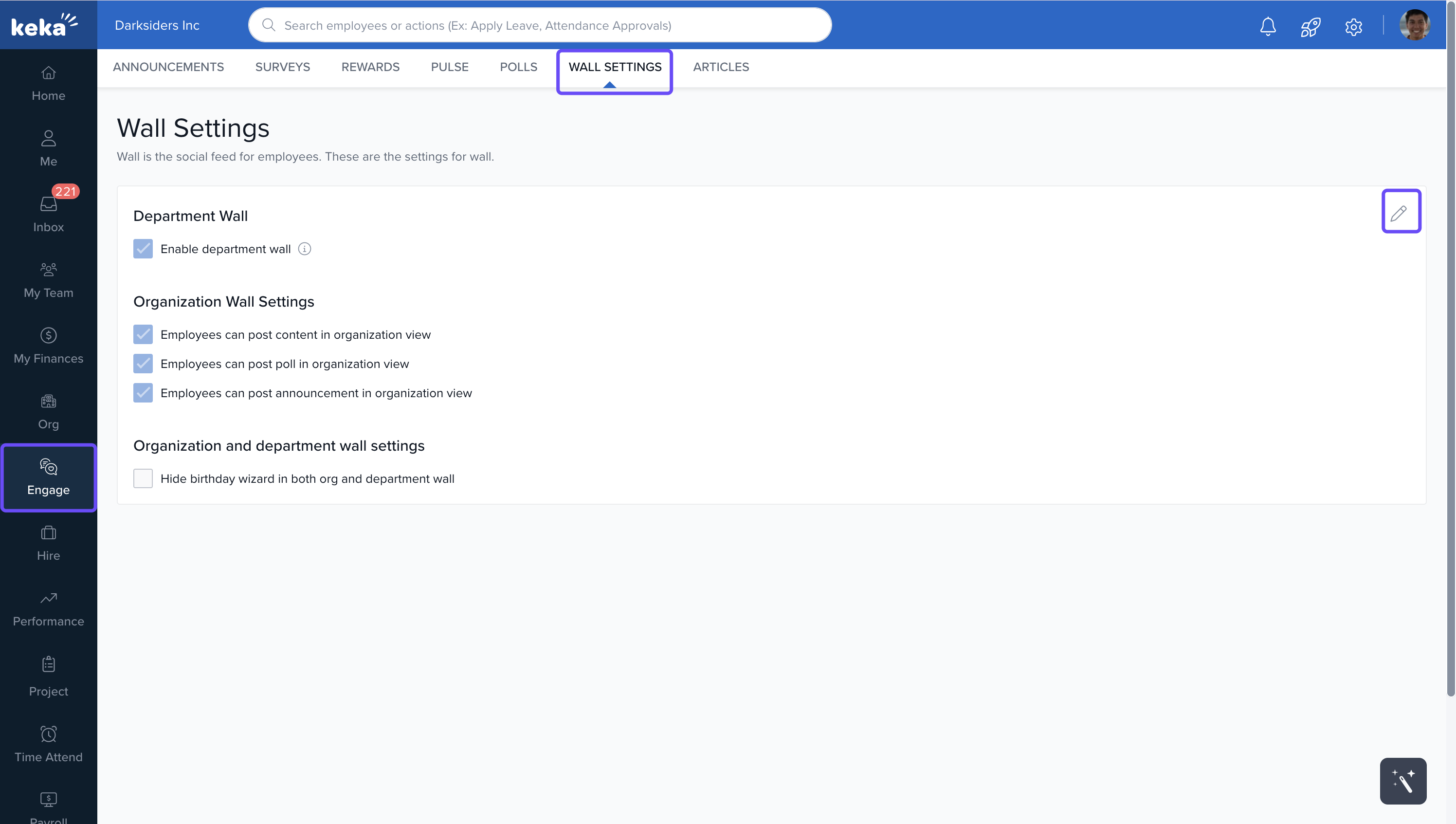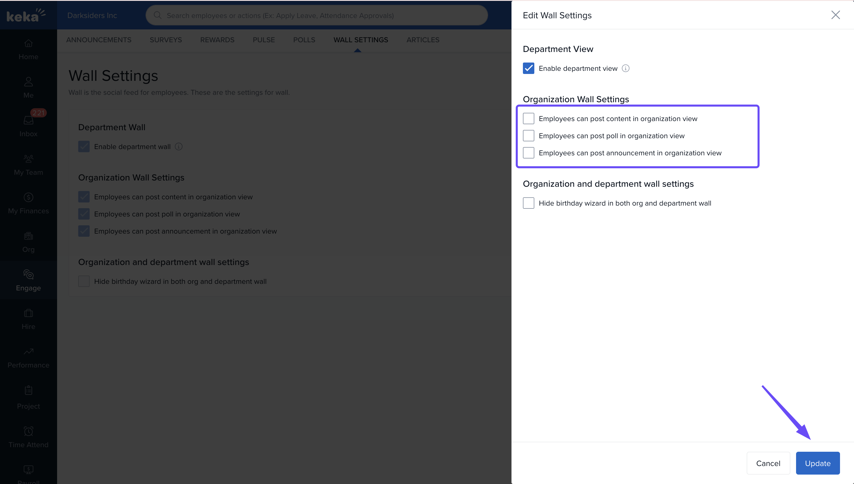 The Keka Home page includes an organization wall where employees can post announcements, polls, and updates. If you want to restrict posting so that only admins can publish content, you can easily change the wall permissions.