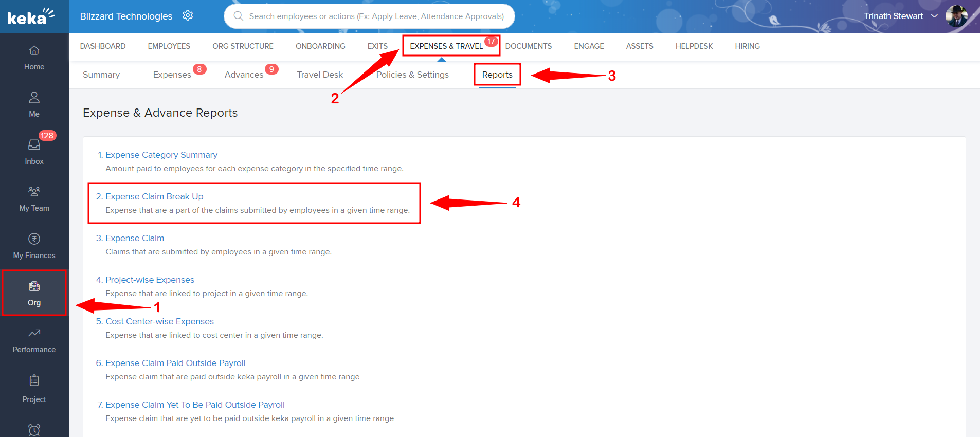 Go to the Org (1) module and into the Expenses and Travel (2) tab where you'll see the Reports (3) section. Download the second report Expense Claim Break Up (4)