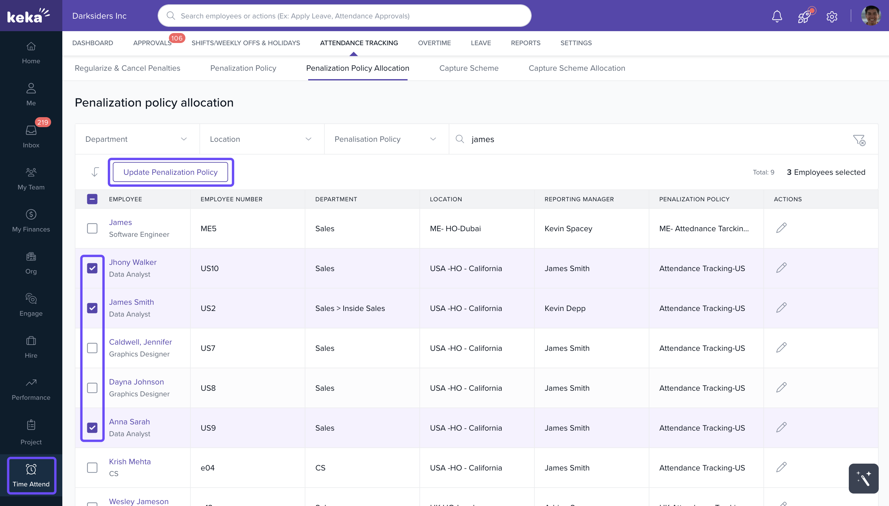 - Open the Penalisation Policy Allocation tab to view the list of employees assigned to various penalisation policies.