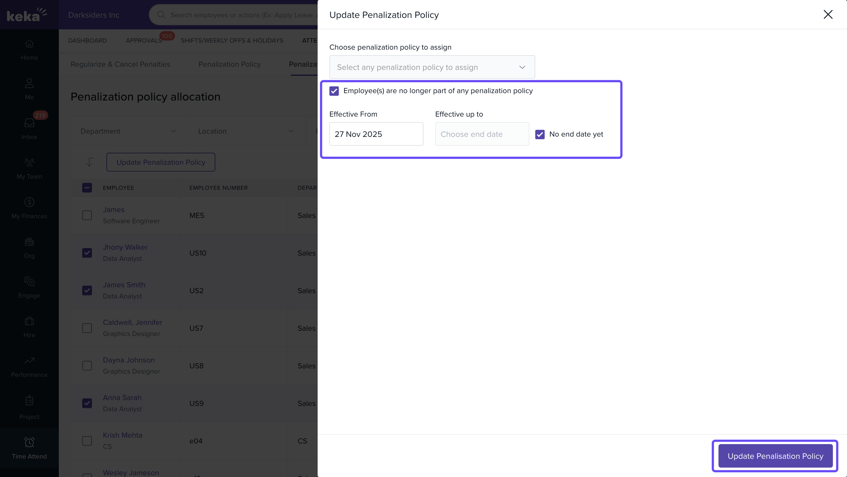 - Select the employees from whom you want to remove the Penalisation Policy.