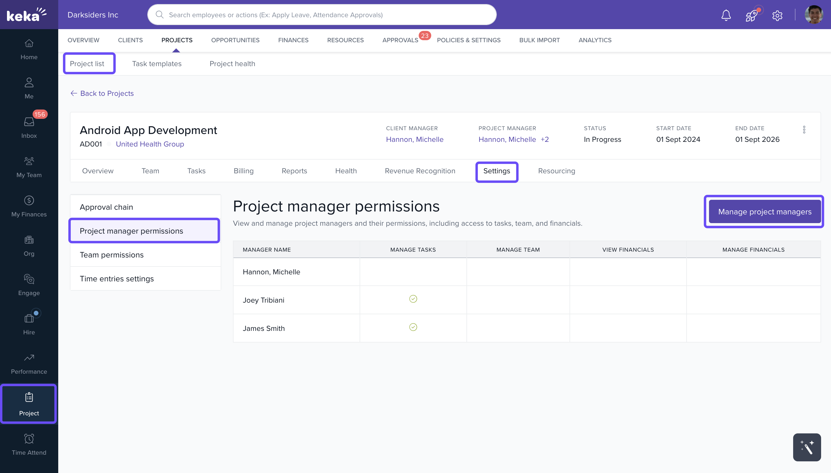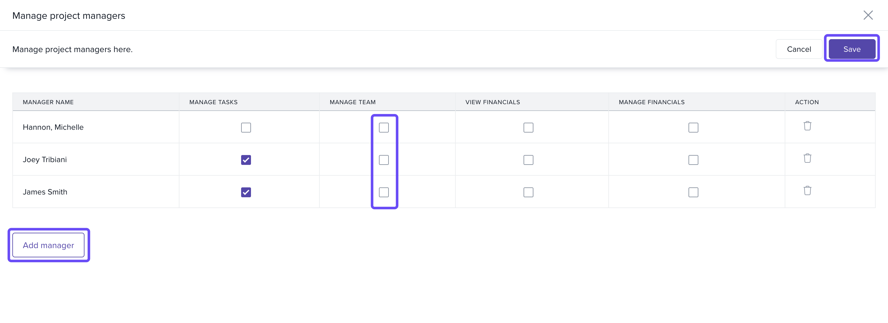 - Use the checkboxes to assign or adjust permissions for each Project Manager.