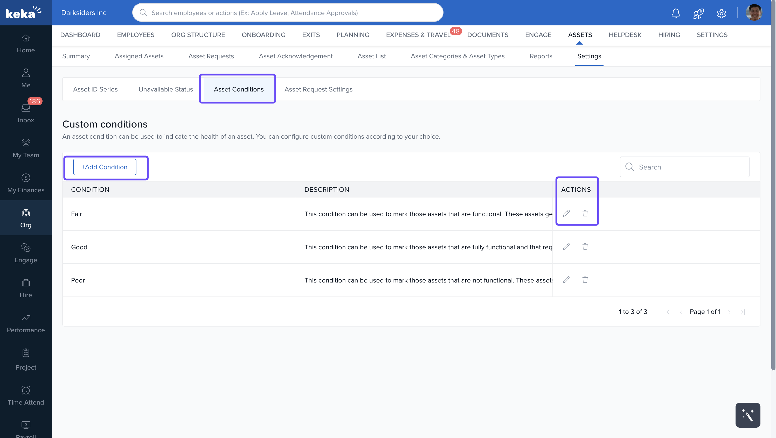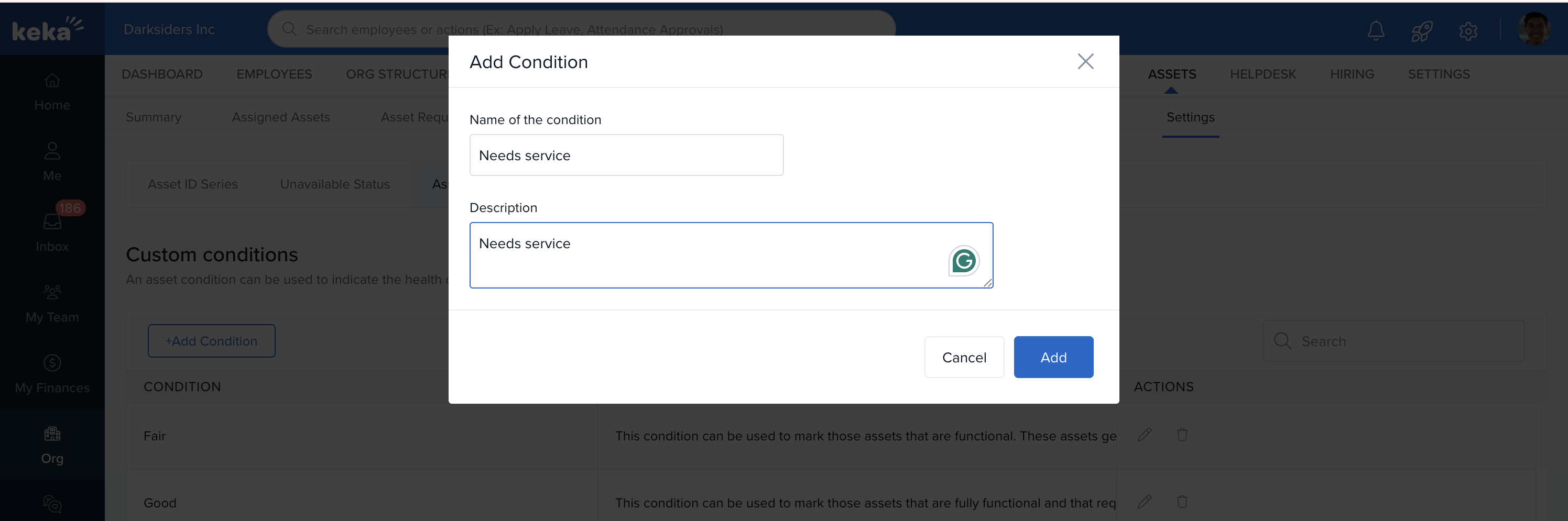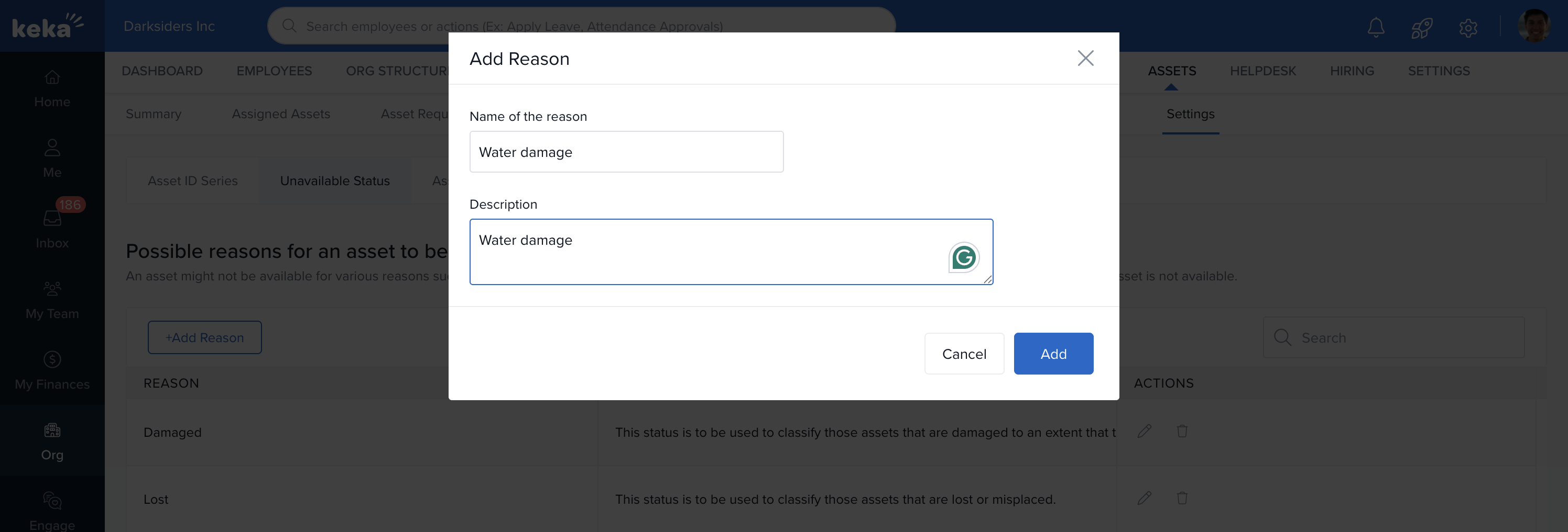 In any organization, assets may become unavailable due to damage, loss, or repair. Keka allows you to add custom reasons for asset unavailability and update the asset conditions to keep track of their status.