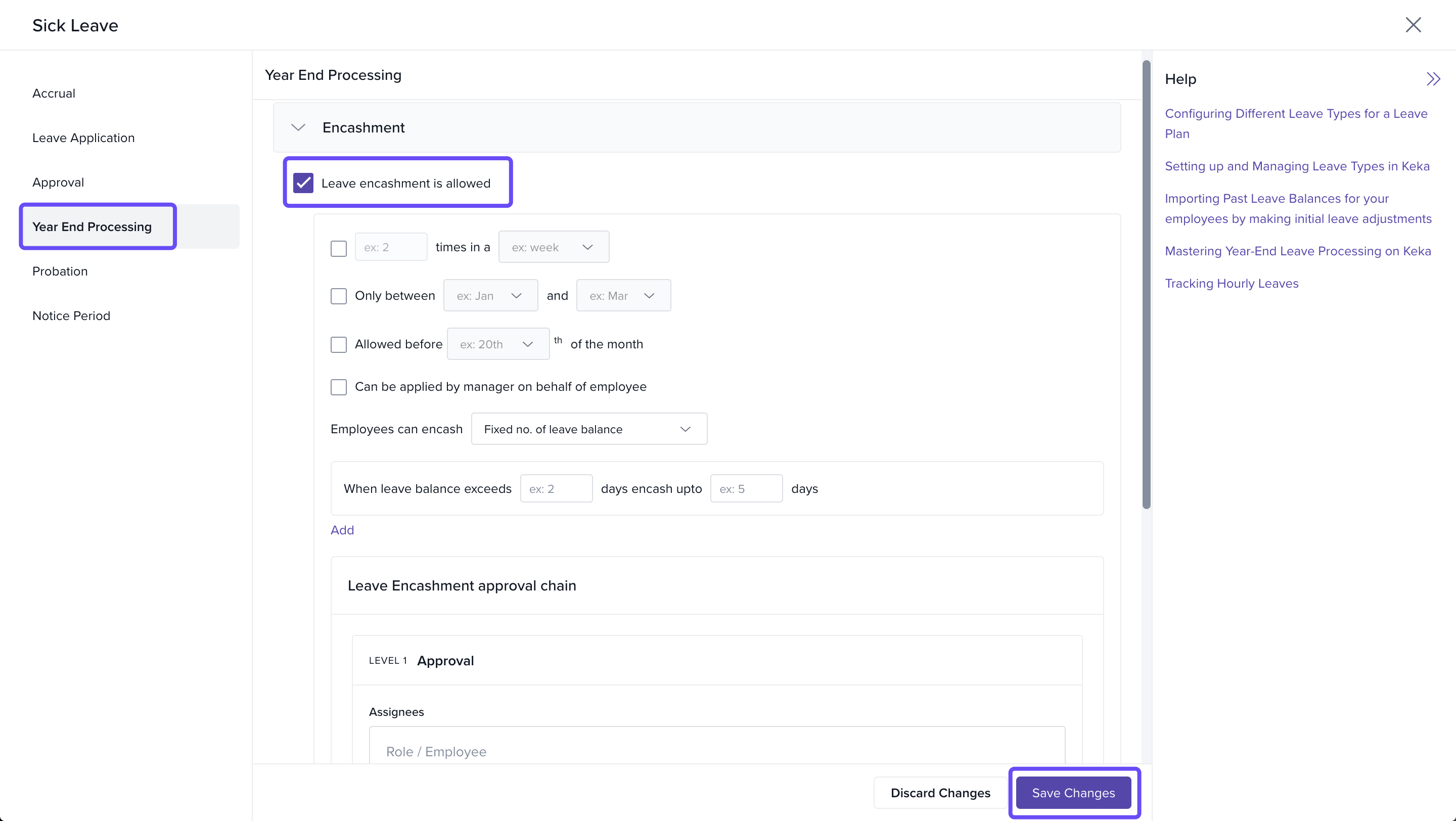 - In the Year End Processing section, check the box for Leave encashment is allowed under the Encashment dropdown.