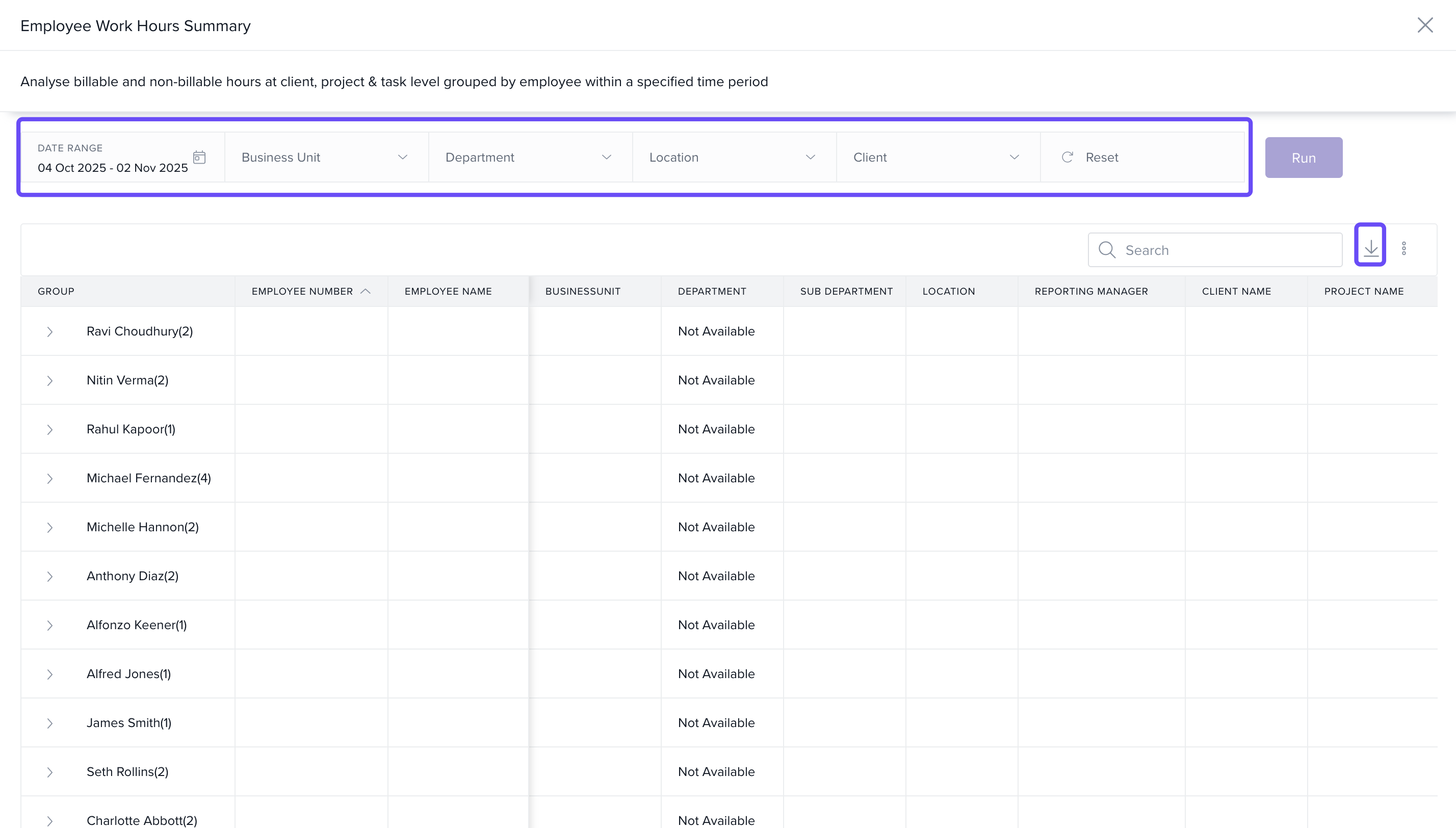 - Review the Billable and Non-Billable hours displayed for each employee by project.