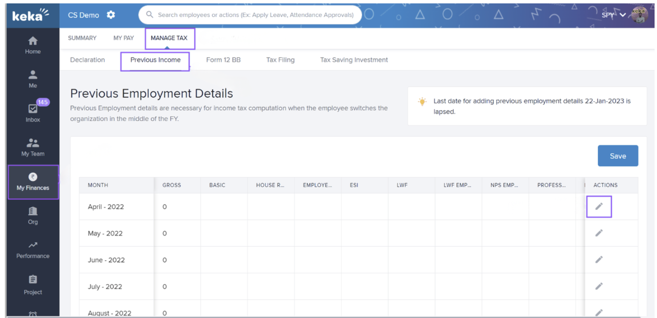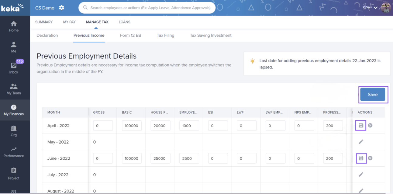 If you've joined the company mid-year, you can declare your previous employer’s income to ensure accurate TDS (Tax Deducted at Source) calculation.