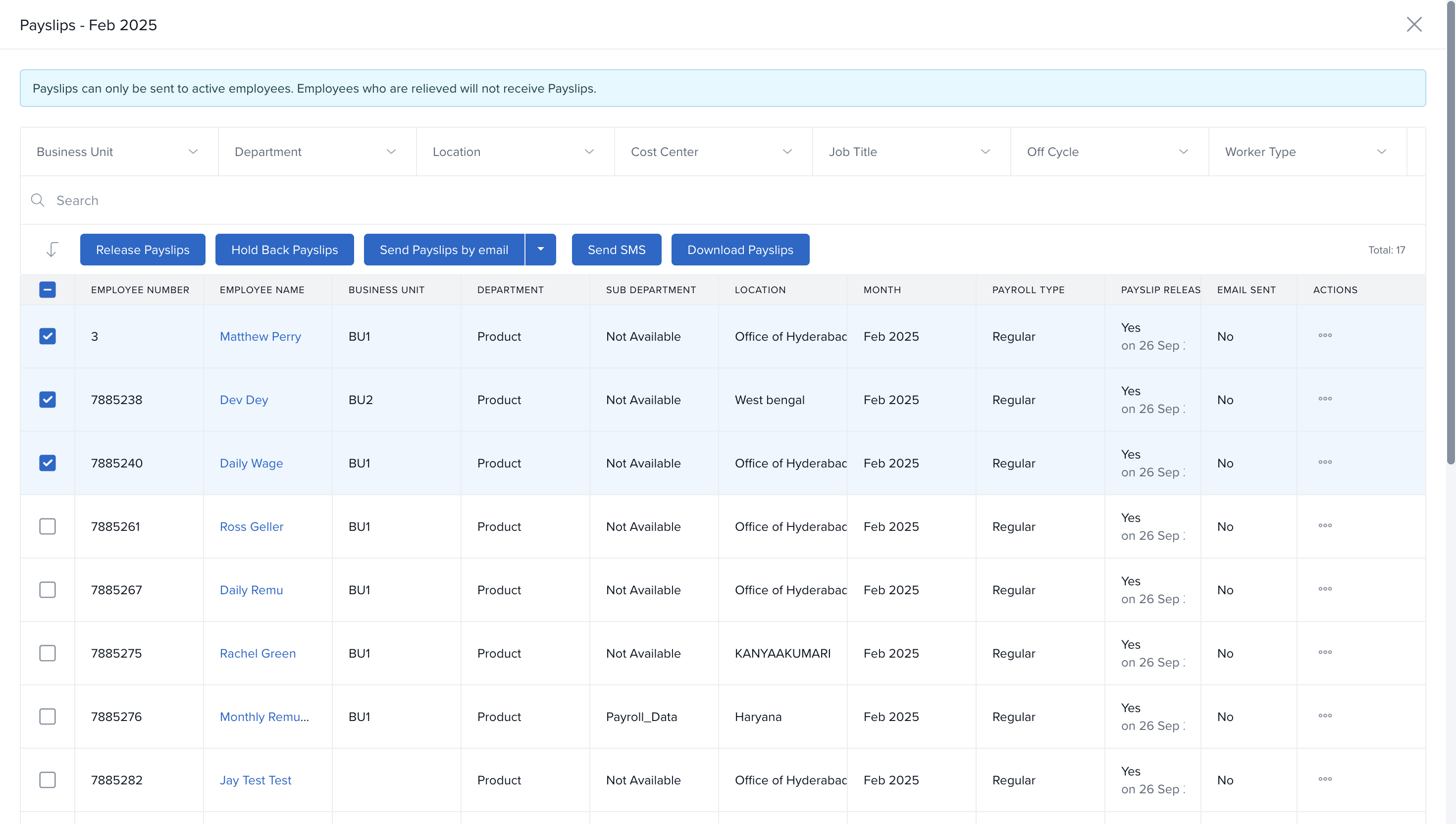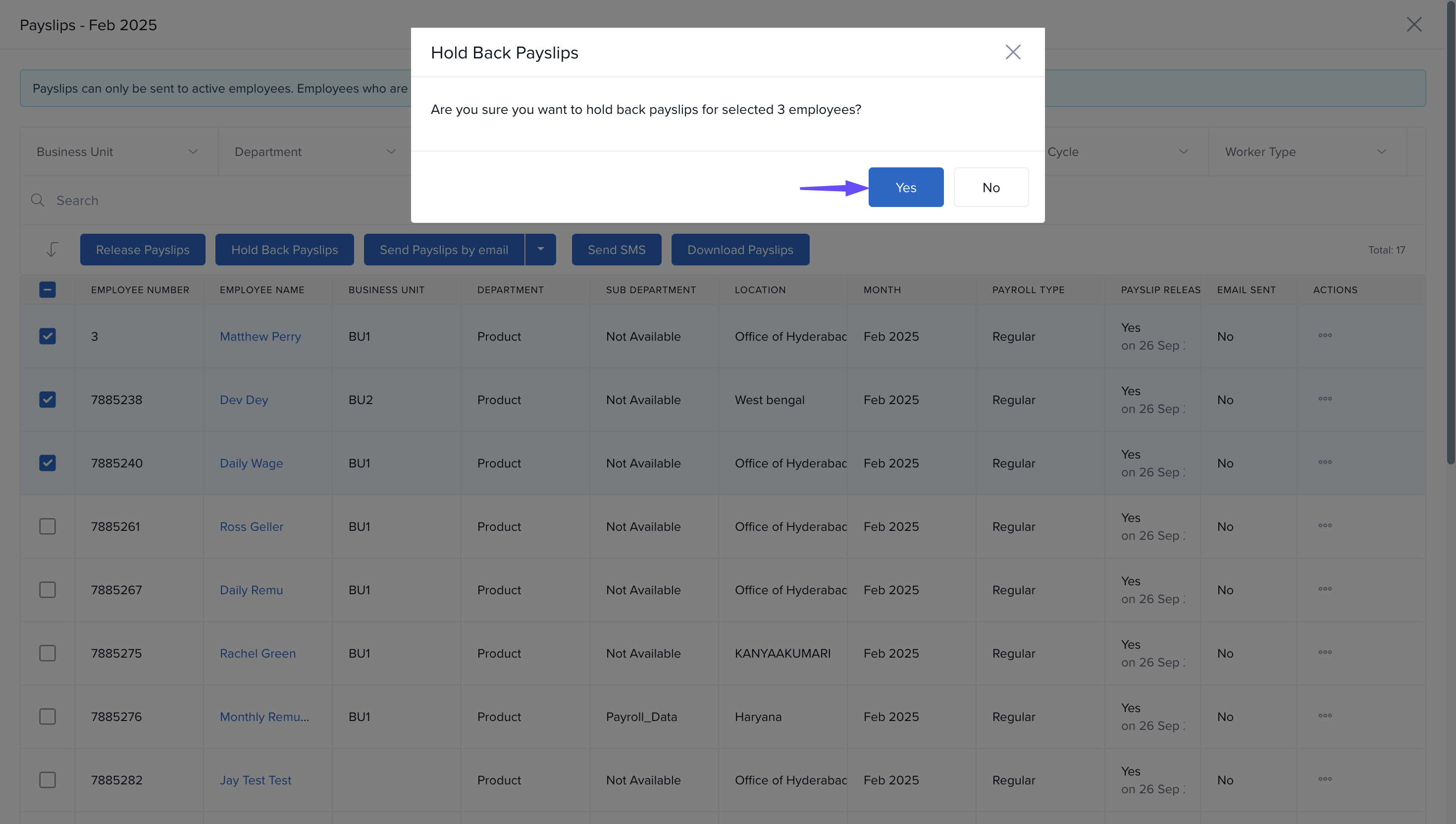 To restrict access, select the employee(s) and click Hold Back Payslips.