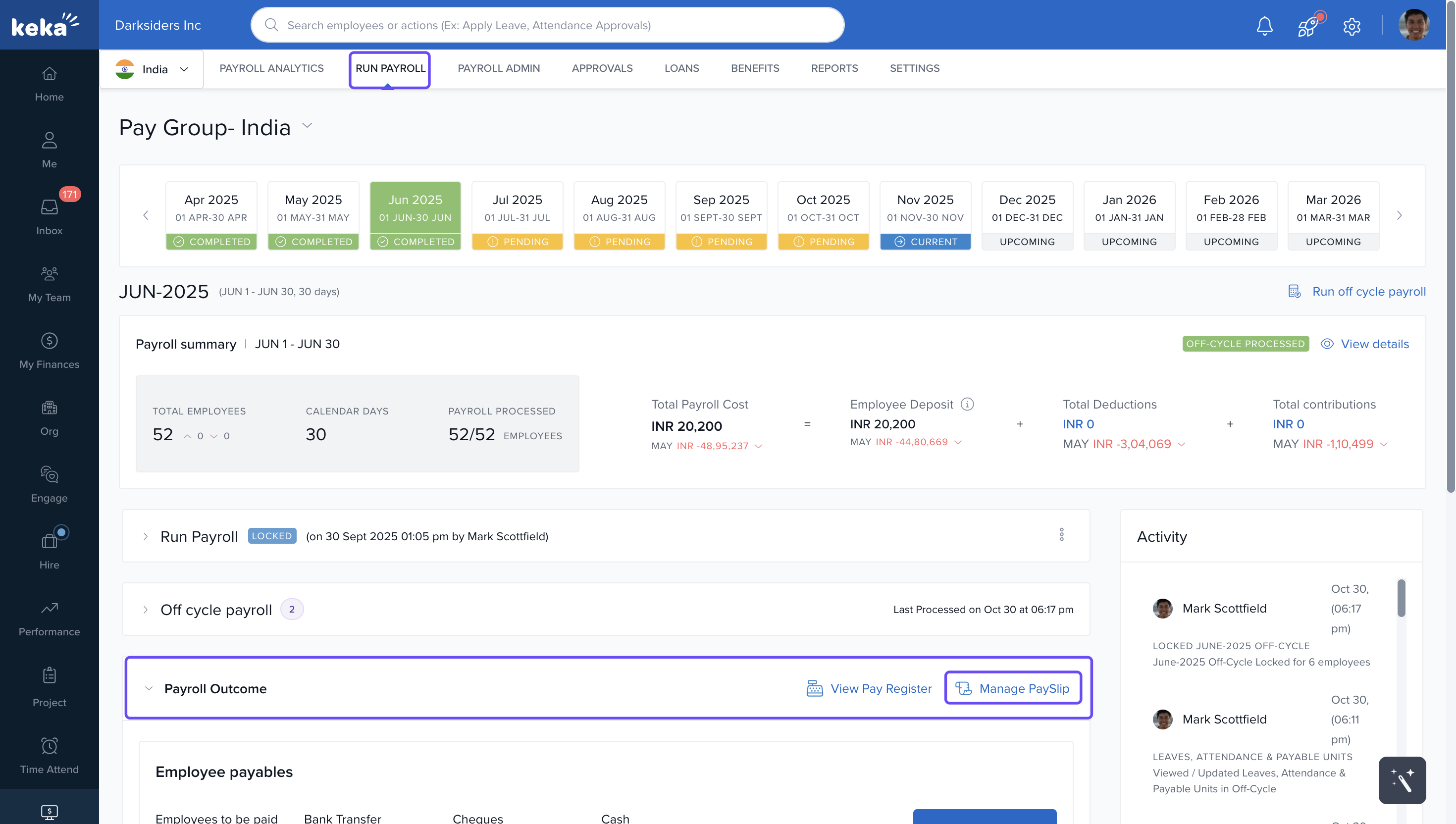 Scroll down to Payroll Outcome and click on Manage Payslips.