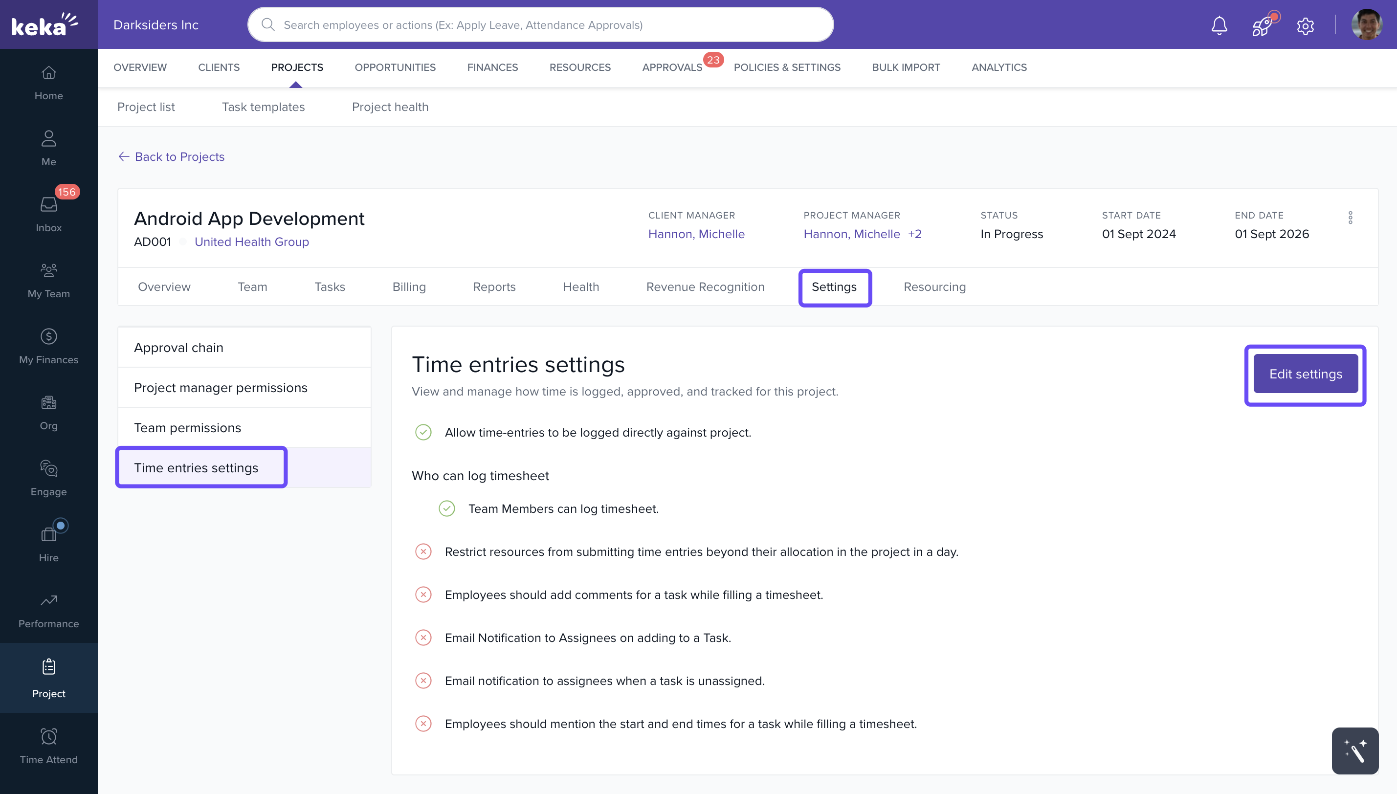 - In the project page, open the Settings section and select Time entries settings.
