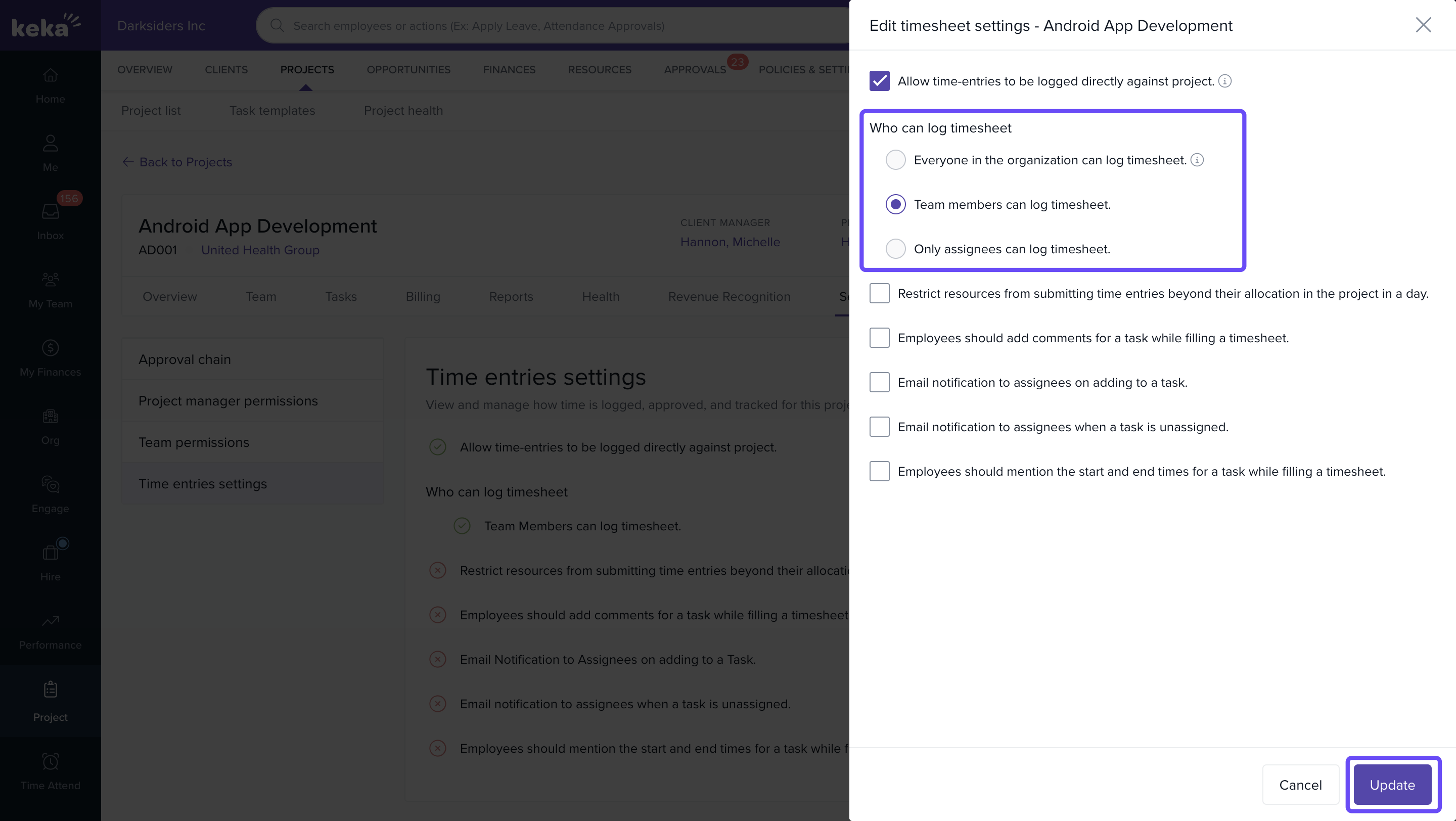 - Team members can log timesheets: Allows all project-assigned employees to log time for any task in the project.