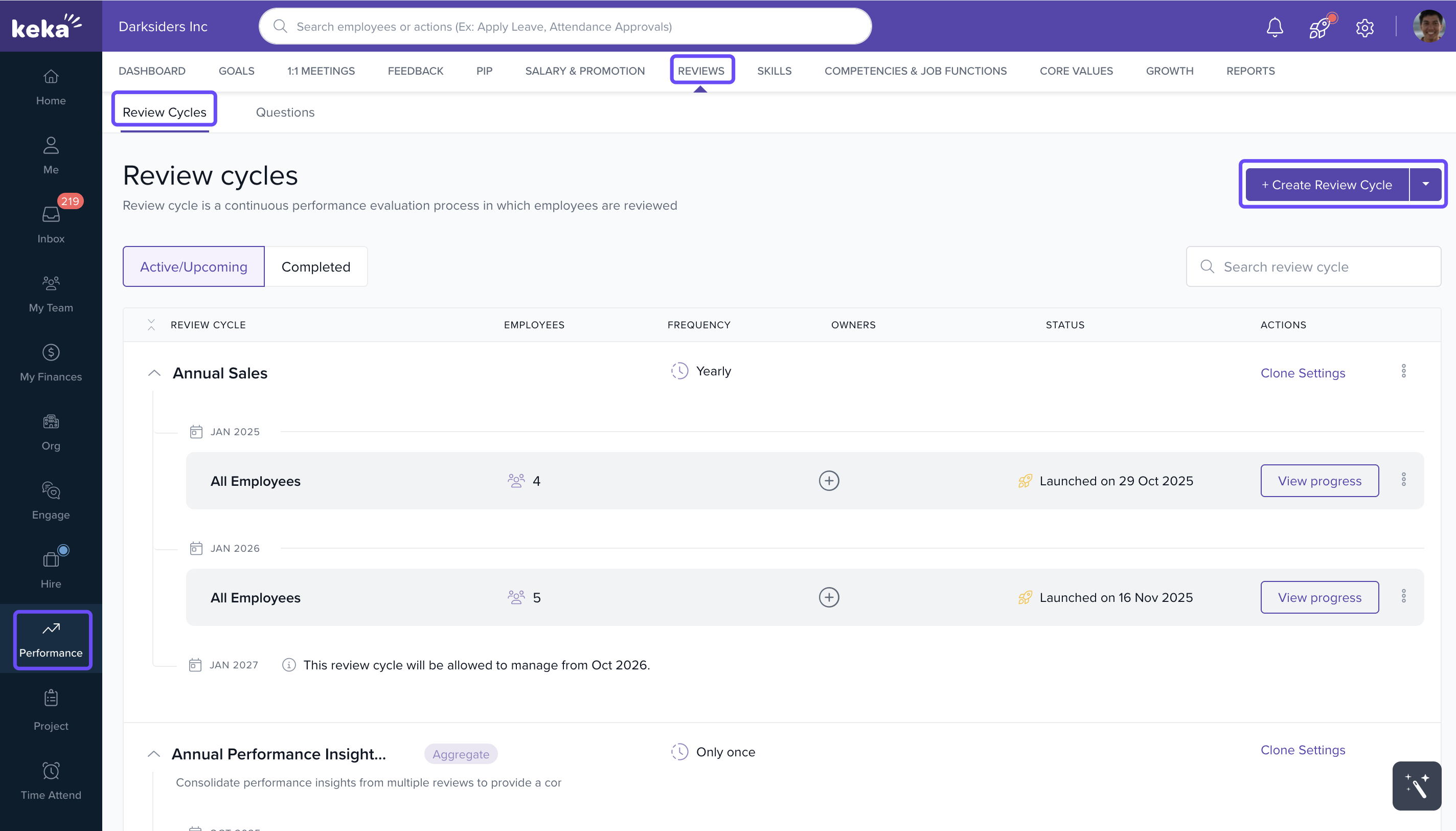 Choose an active review cycle or create a new one by clicking on +Create Review Cycle.