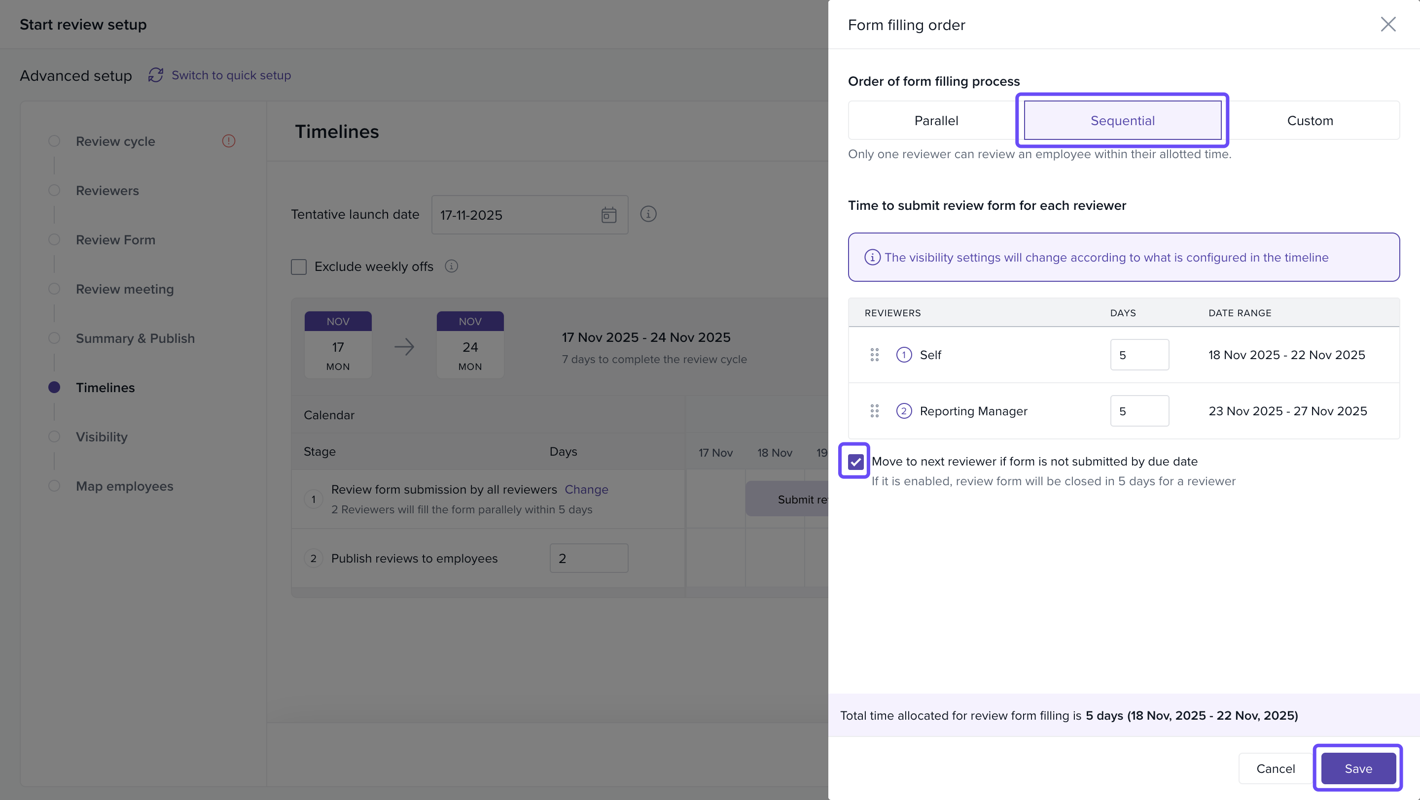 (Optional) Enable the checkbox: “Move to next reviewer if form is not submitted by due date”.