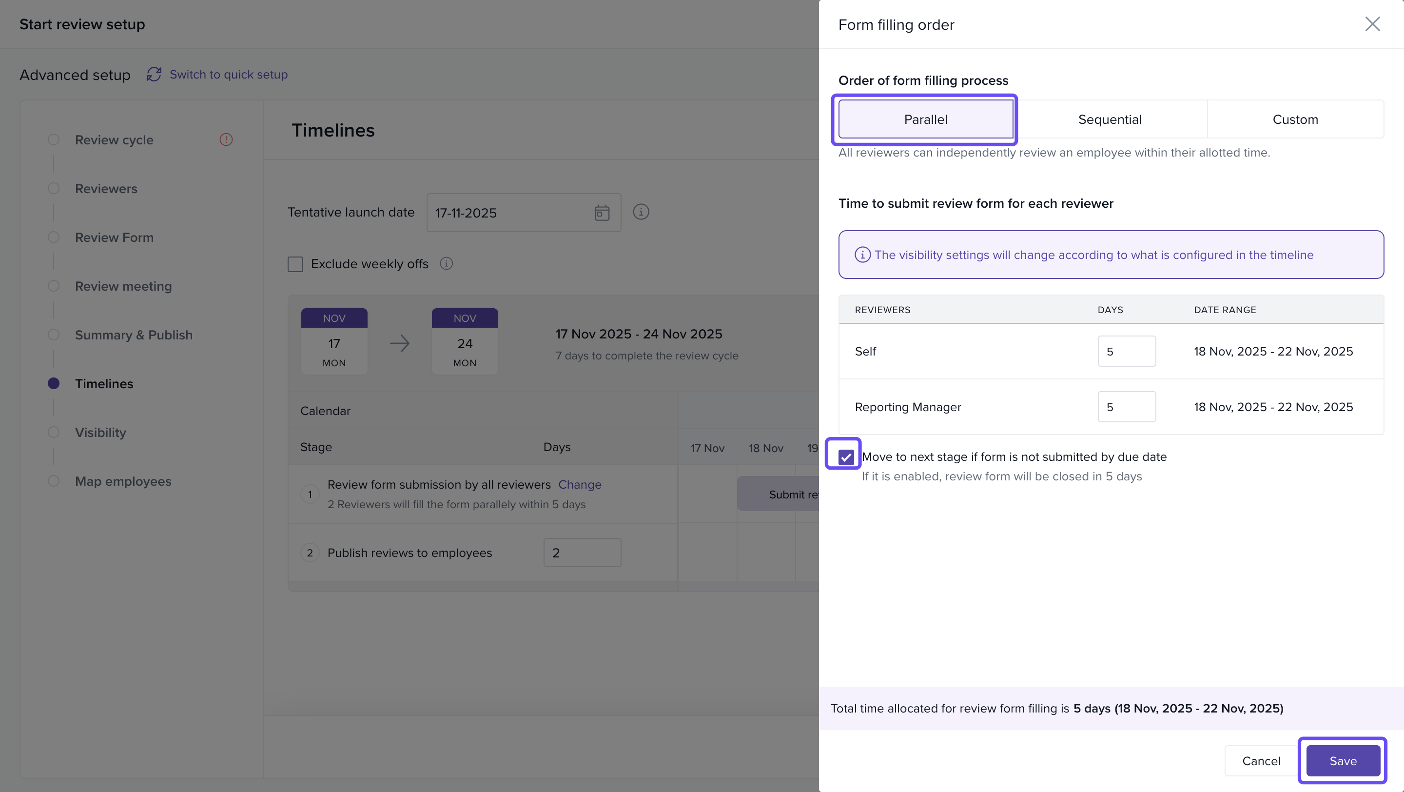 In the Timelines step, choose Parallel as the form filling order.