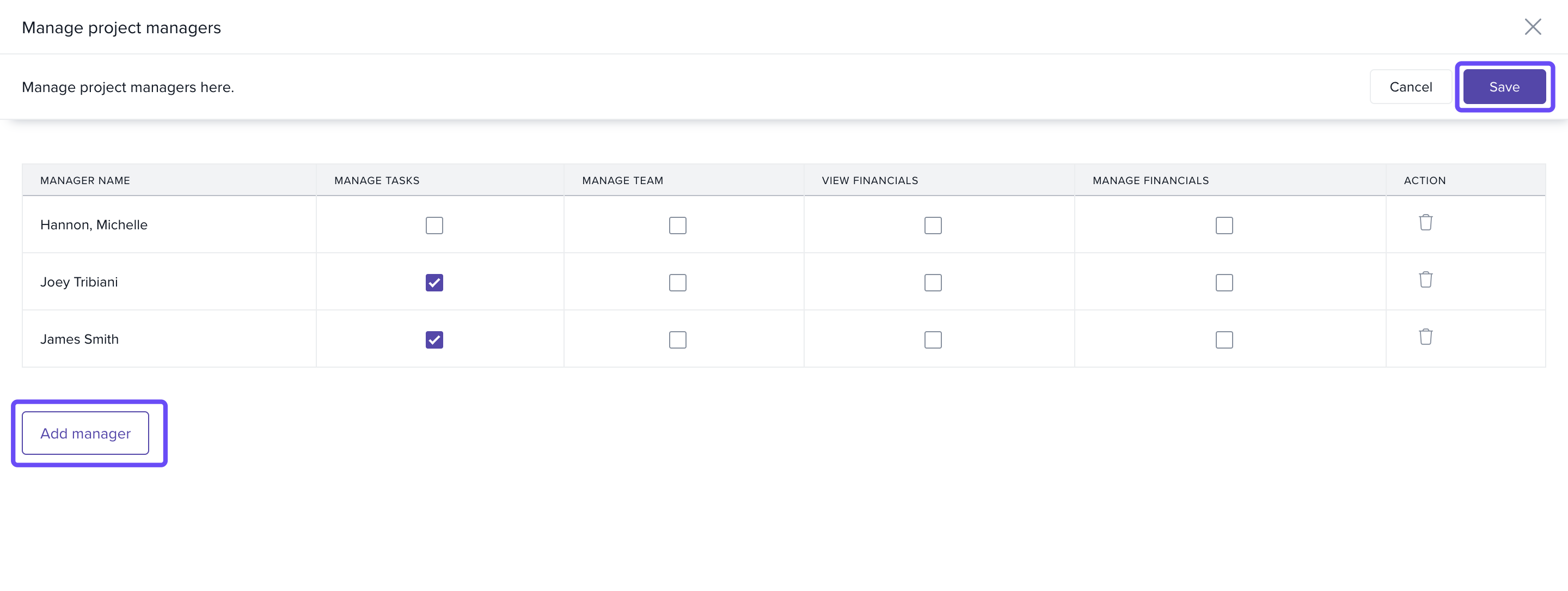 - To remove a manager, click the Delete icon.