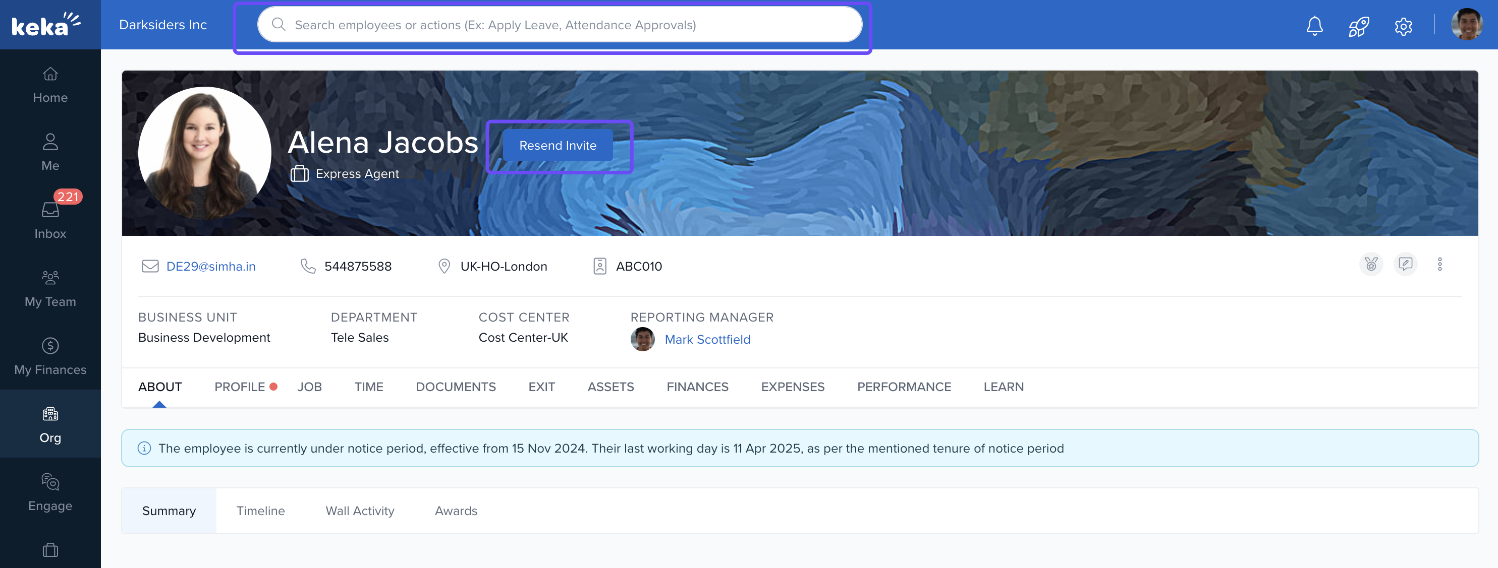 Employees must register on Keka through an email invitation sent to their work email. If the email fails due to firewall or browser restrictions, you may need to resend the invite. You can do this for a single employee or in bulk.