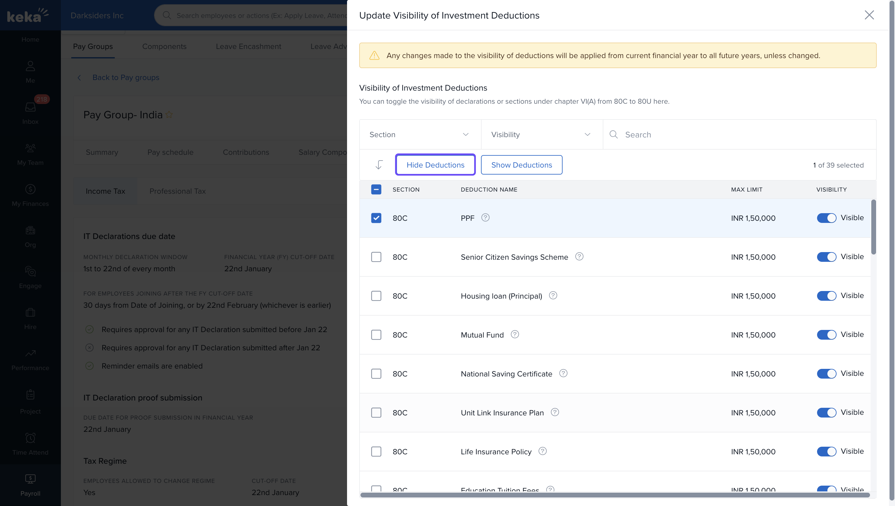 Some income tax circulars list what employees can declare, but not what they shouldn’t. Keka now lets admins hide specific declaration sections to match internal policies.