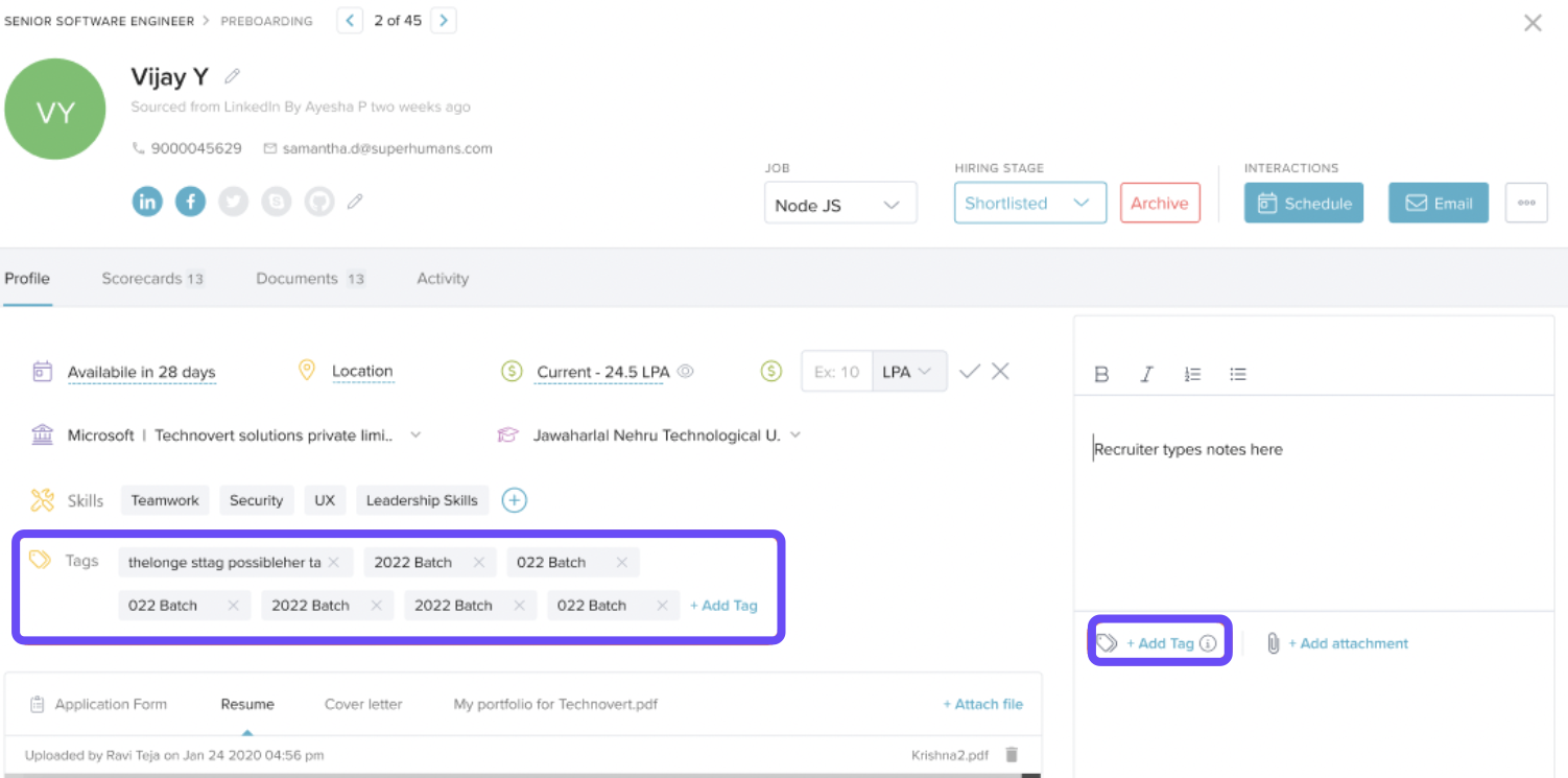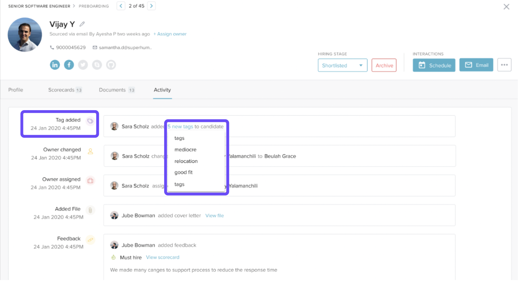 Every time a tag is added, removed, or updated, the change is recorded in the Activity section of the candidate’s profile. This ensures transparency and accurate record-keeping.