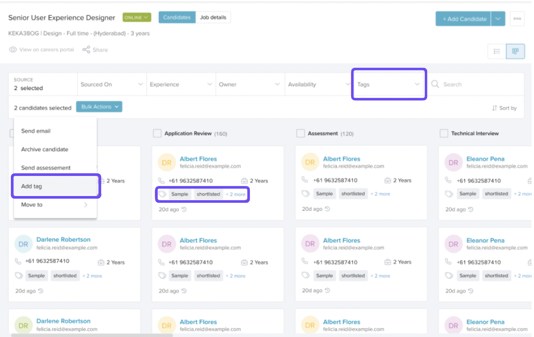 To save time, you can bulk-tag candidates directly from the job stages or kanban view. This helps when managing high volumes of applicants.