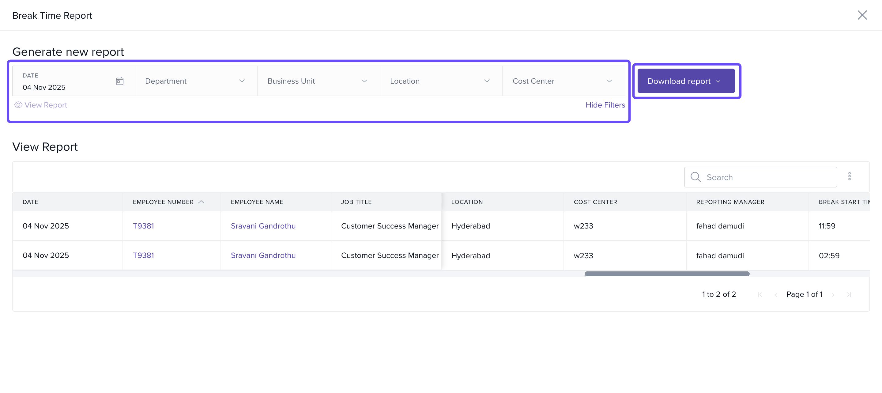 - Click View Report to generate the break time report.