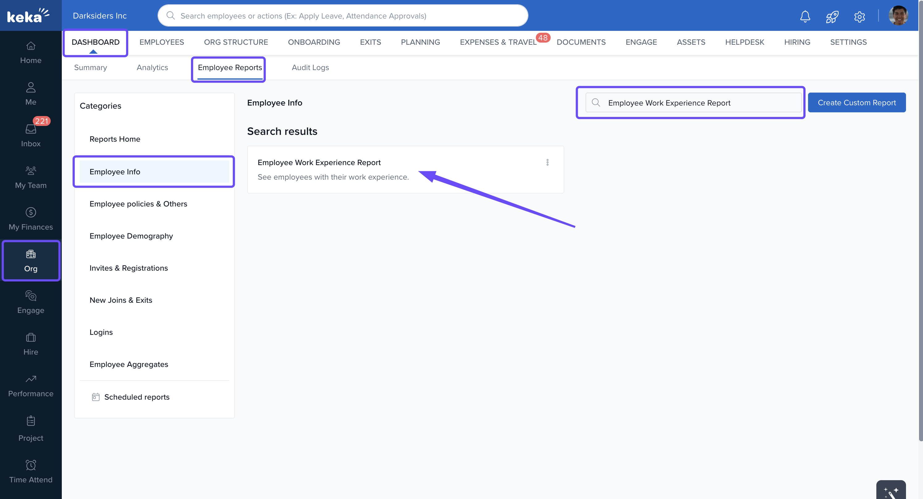Scroll down to the Employee Info section and click on Employee Work Experience Report. You can also use the search bar.