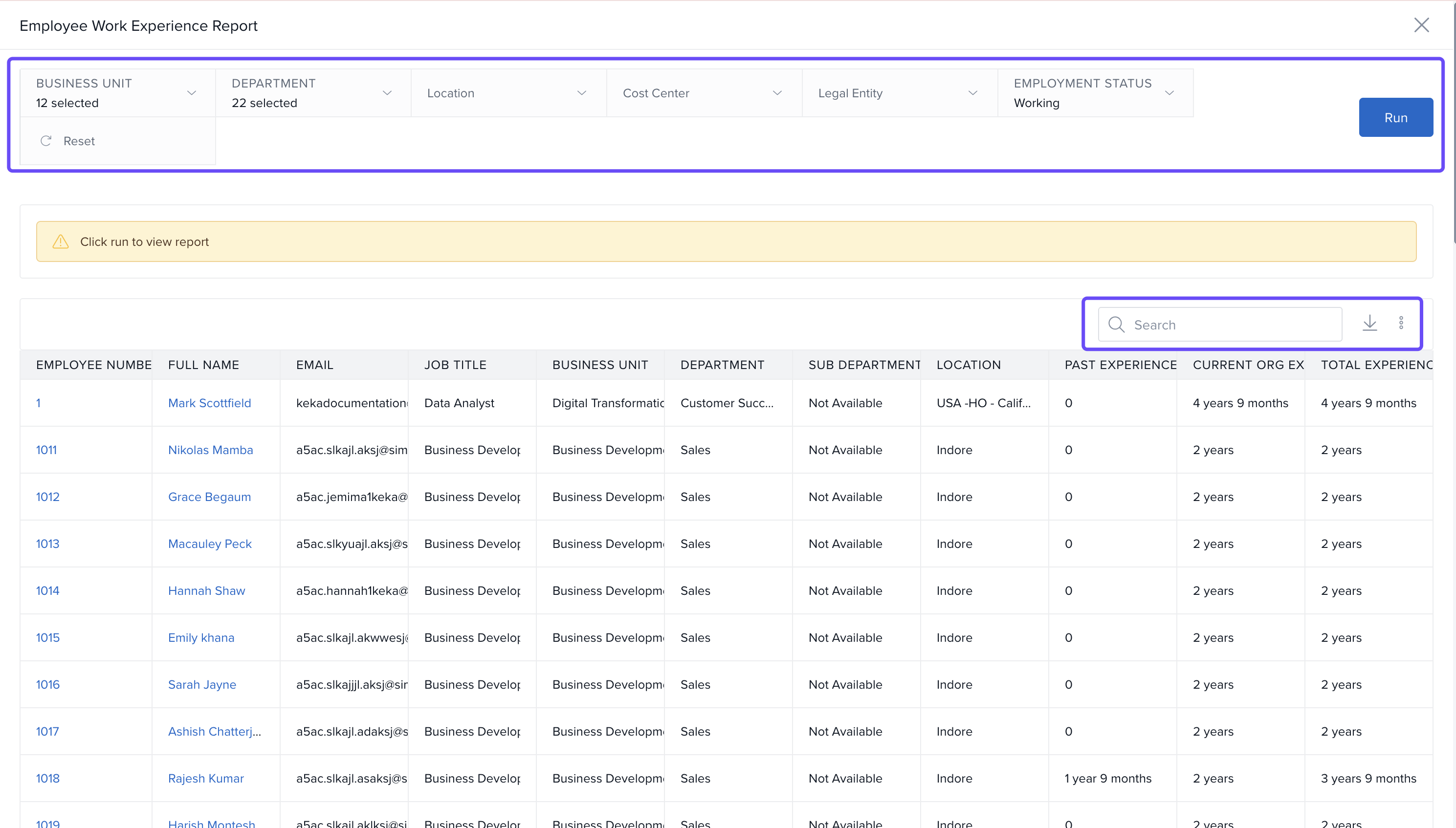 The Employee Work Experience Report provides details about the total work experience of employees along with the past and current experience shown individually.