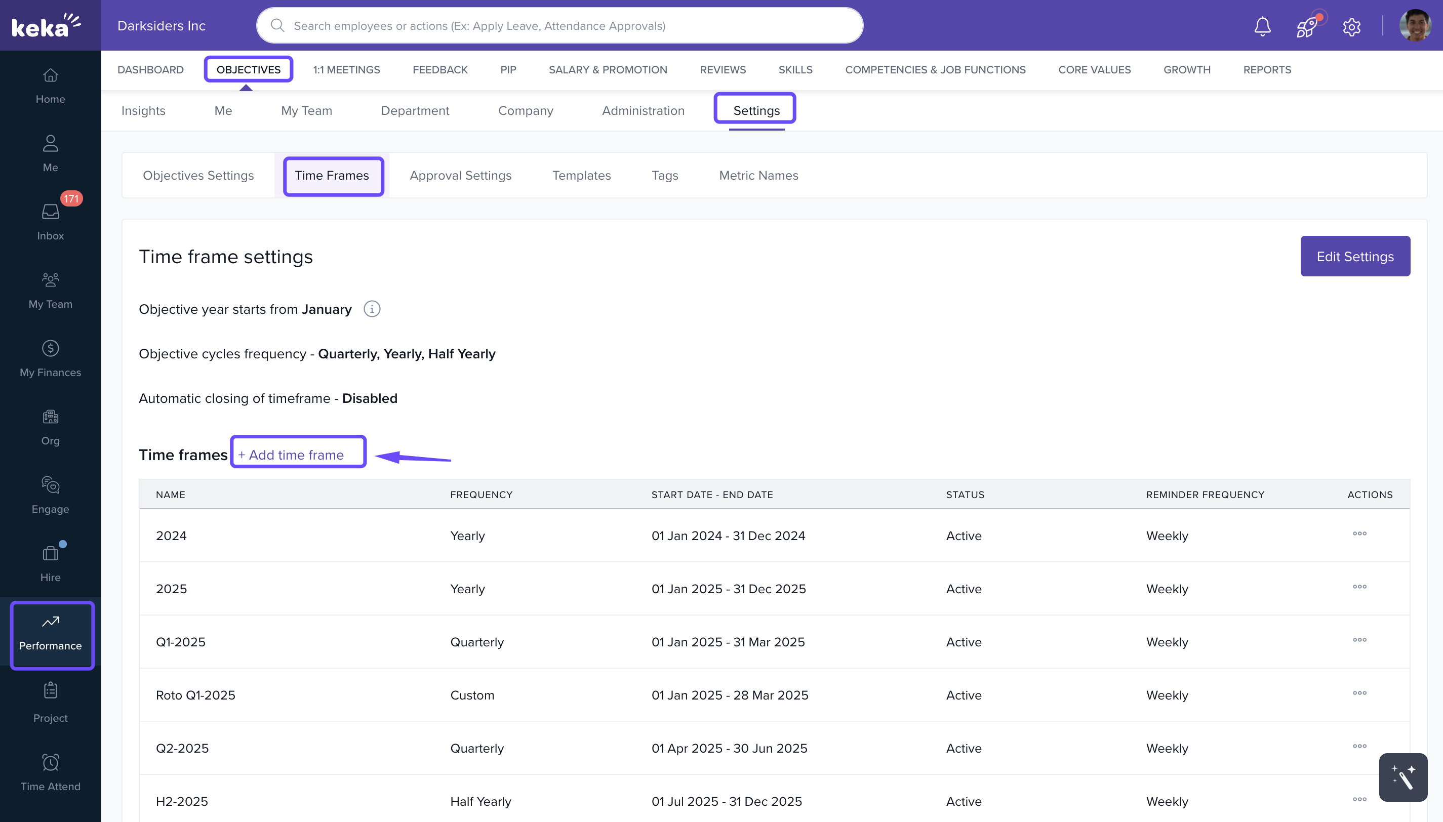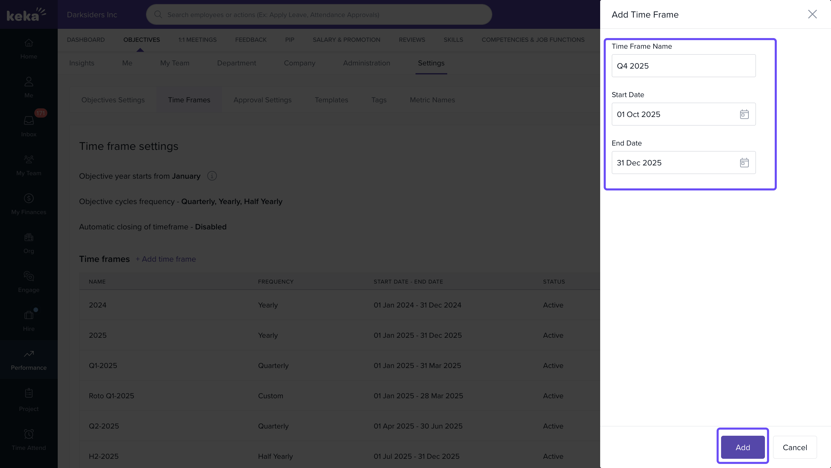 This is how a performance admin can easily add a custom timeframe in Keka to ensure goal-setting aligns with organisational timelines. If you need further assistance, feel free to contact our support team.