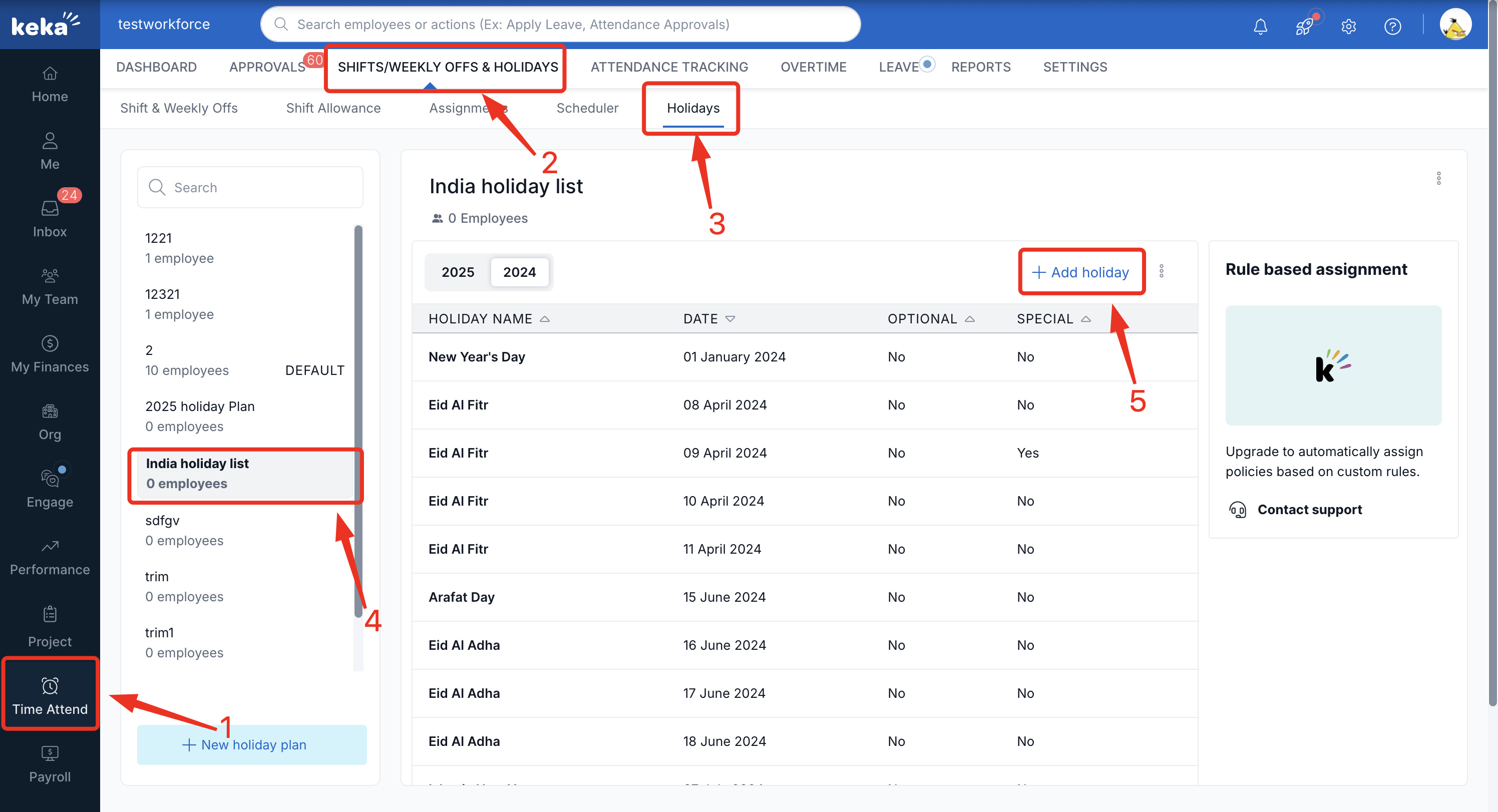 To add a holiday in the next calendar year to a holiday list, you can go to Time Attend (1) and select Shift/Weekly Offs & Holidays (2) and select Holidays (3). Here, you will see the holiday lists added. Select one(4) and click +Add holiday (5).
