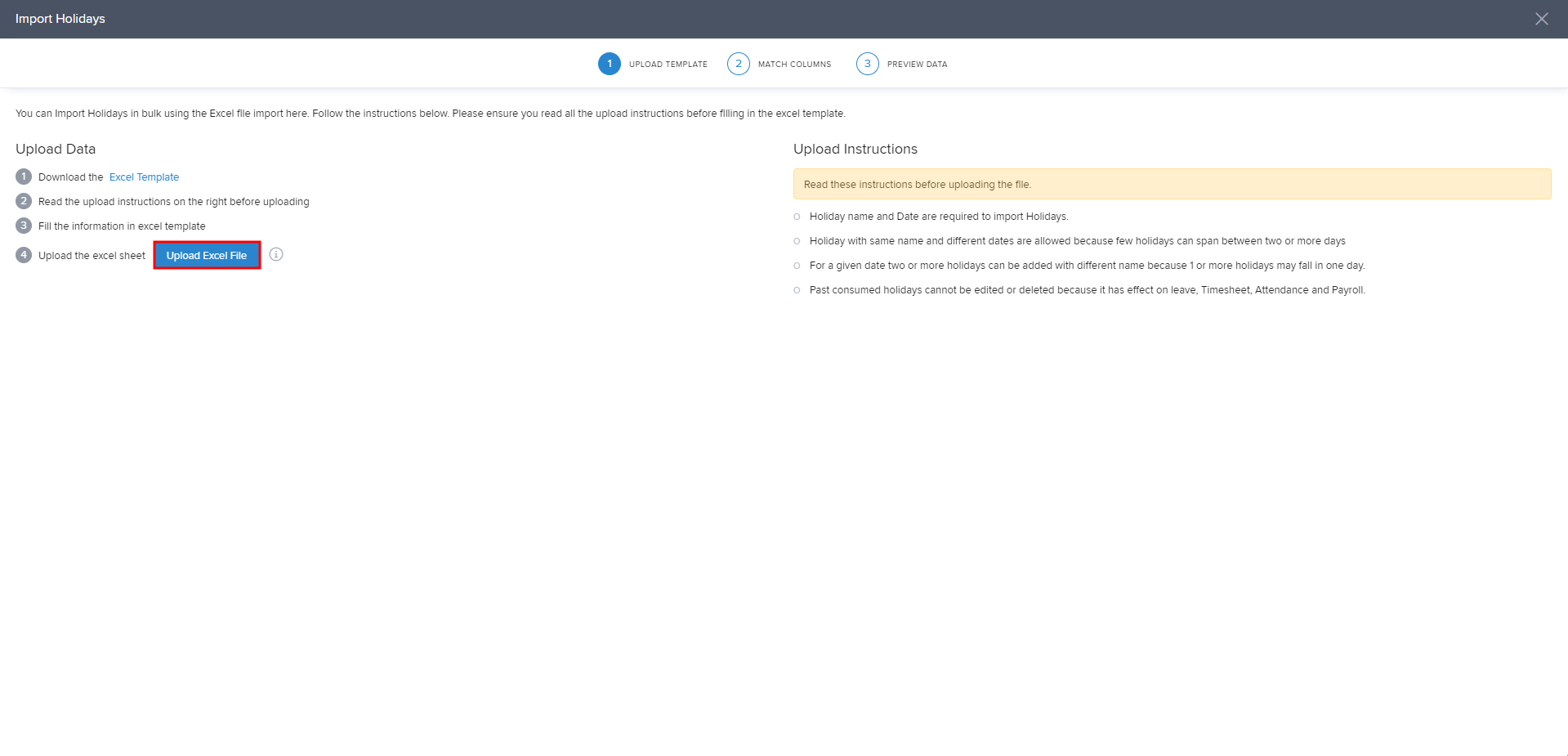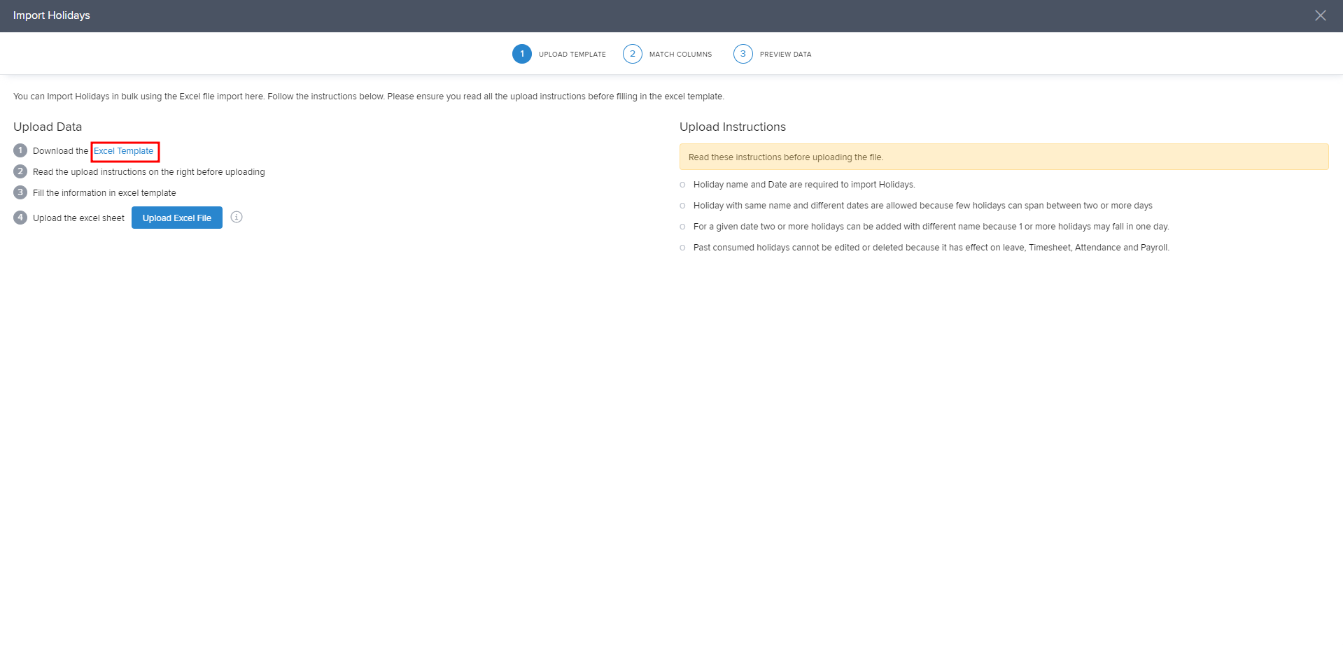 You can also use the bulk import option to import the holidays. To bulk import, click the 3 dot menu adjacent to +add holiday and select Import from excel.
